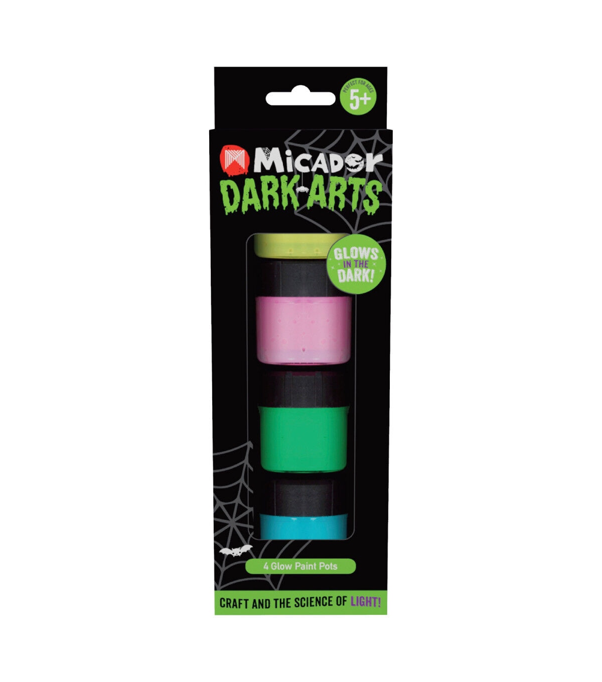 These Glow Paint Pots from Micador Dark Arts are great for paper, wood, fabric, plaster, canvas and more. The glow-in-the-dark pigments contain phosphors. They absorb UV light photons and hang on to them, slowly emitting new photons with much lower energy. This set includes four 10ml pots of glow-in-the-dark paint. Store with lid tightly secured in a cool, dry place. Use the Dark Arts Magic Black Light to make colors glow for full effect. Young artists love the glowing effects of the phosphorescent paint. It can be used to create spooky designs that shine bright in the dark.