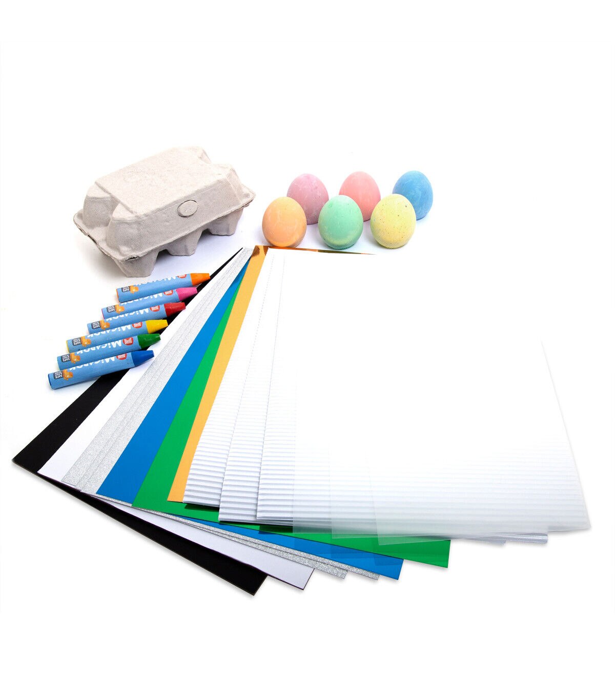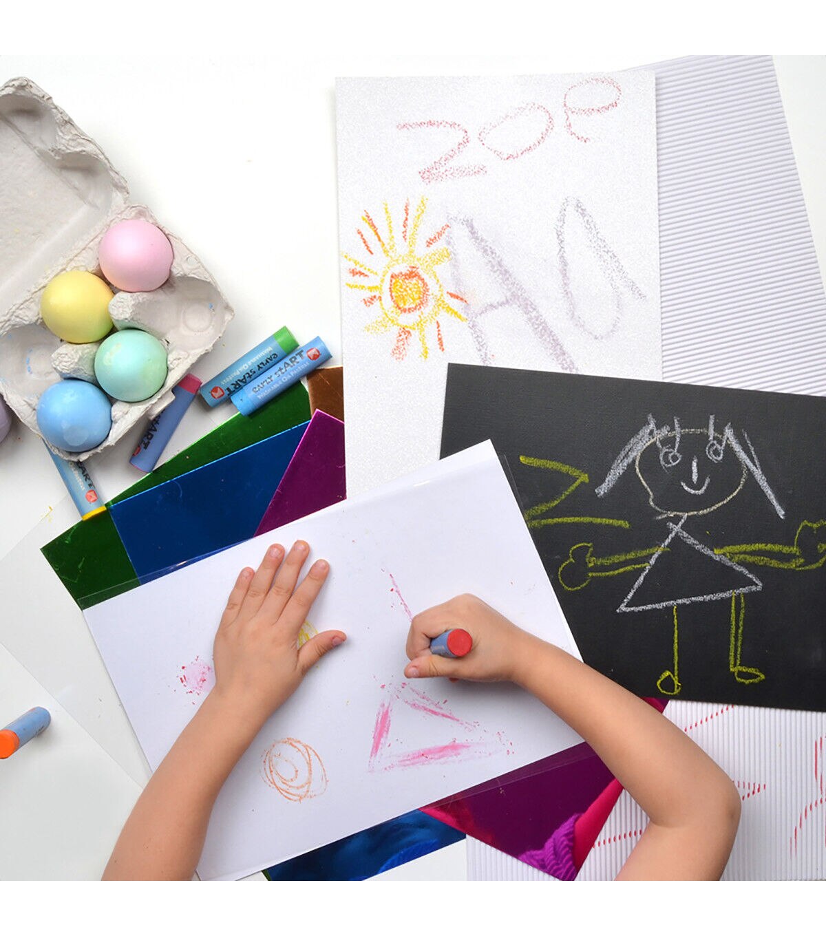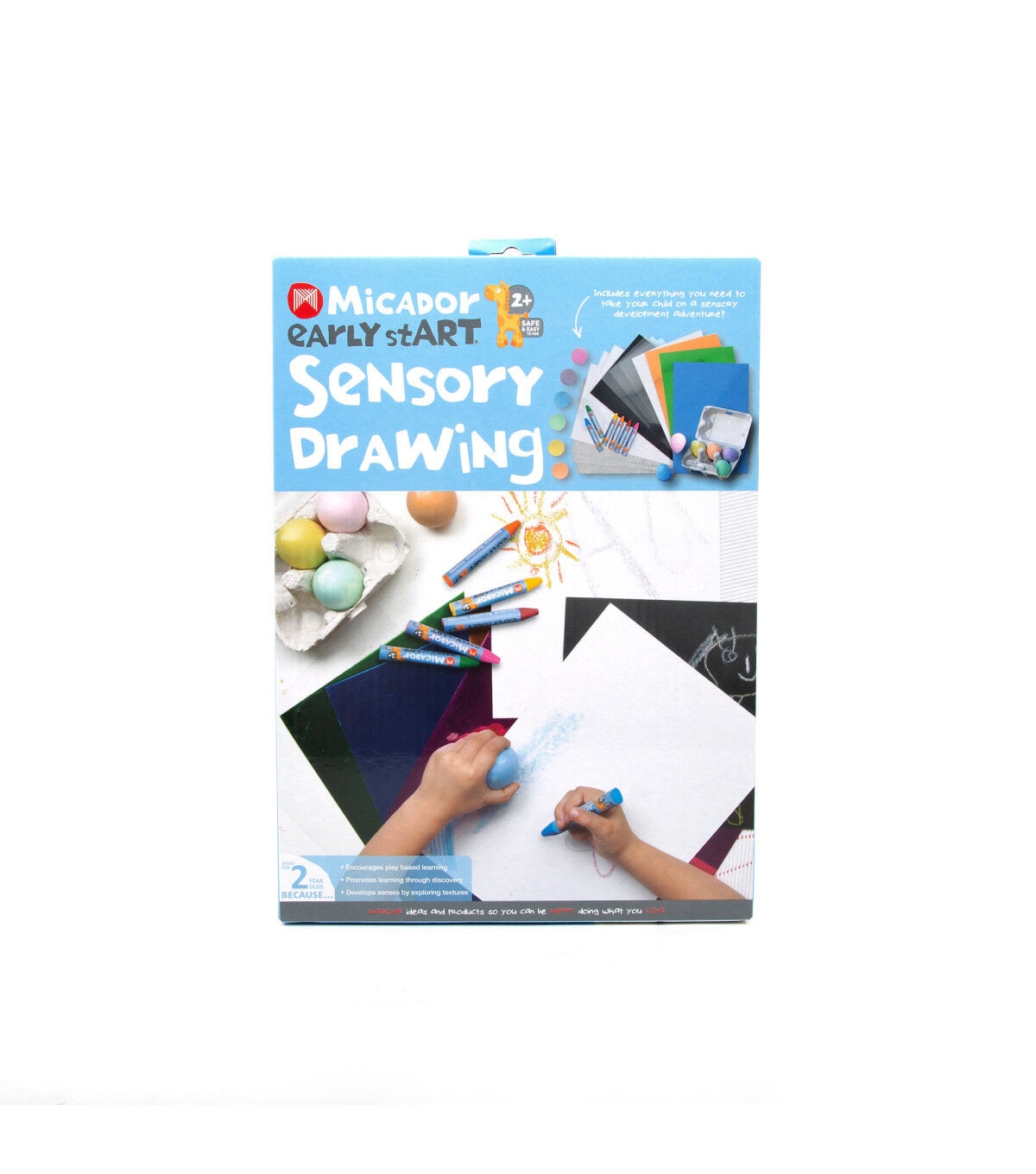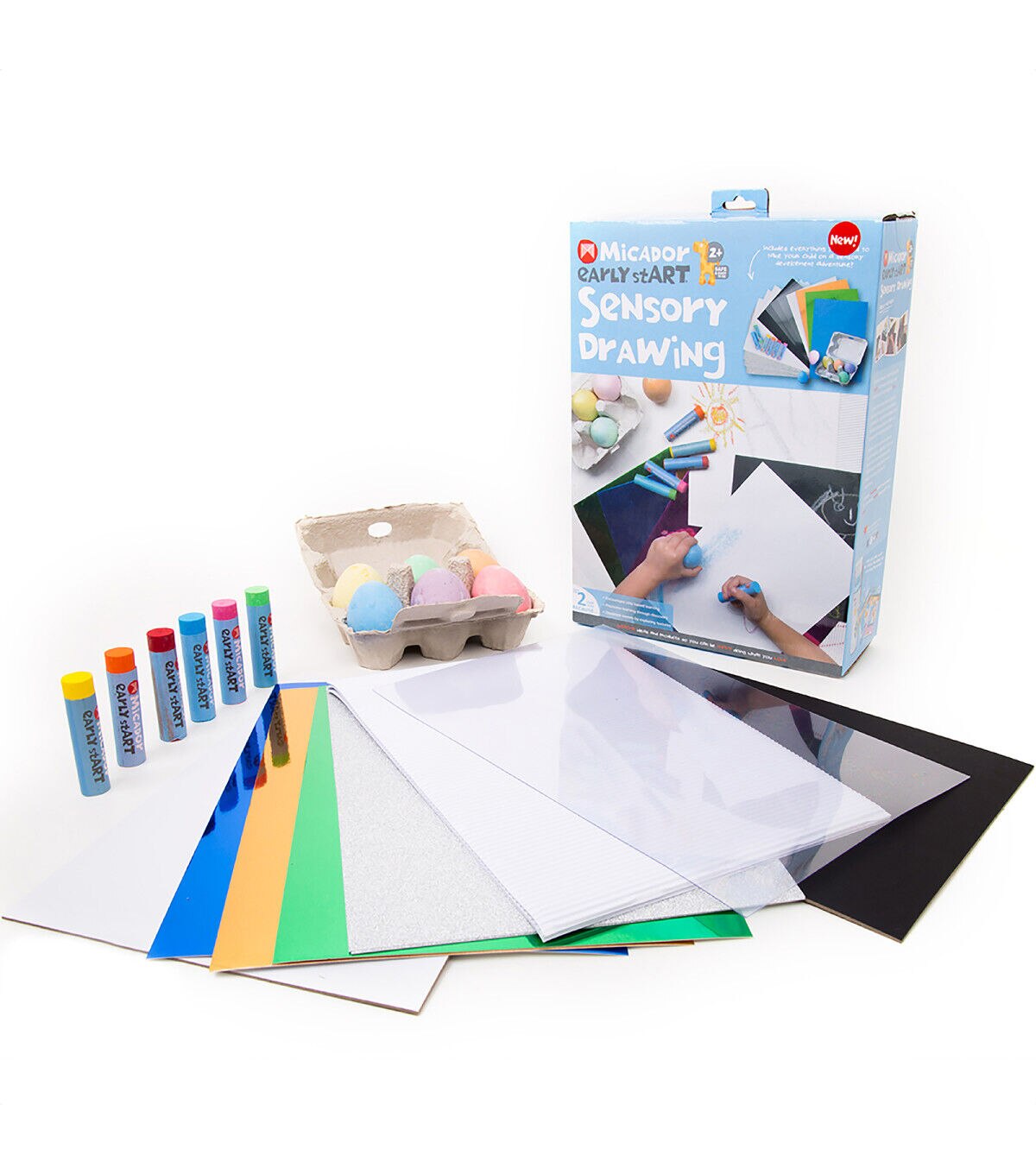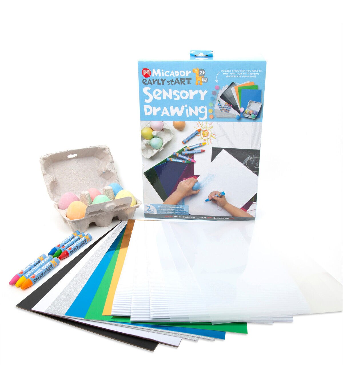 This Sensory Drawing Pack includes everything needed to take children on a sensory development adventure! This pack is designed to encourage sensory development, develop fine motor skills, promote imaginative play and emotional expression. Choose from a variety of mediums and textures, including Softies Tri-Grip Crayons, powdery Egg Chalk, a bumpy colored card, a shiny colored card, a rough glitter card, a glossy plastic sheet, a textured white art board and a textured black art board.