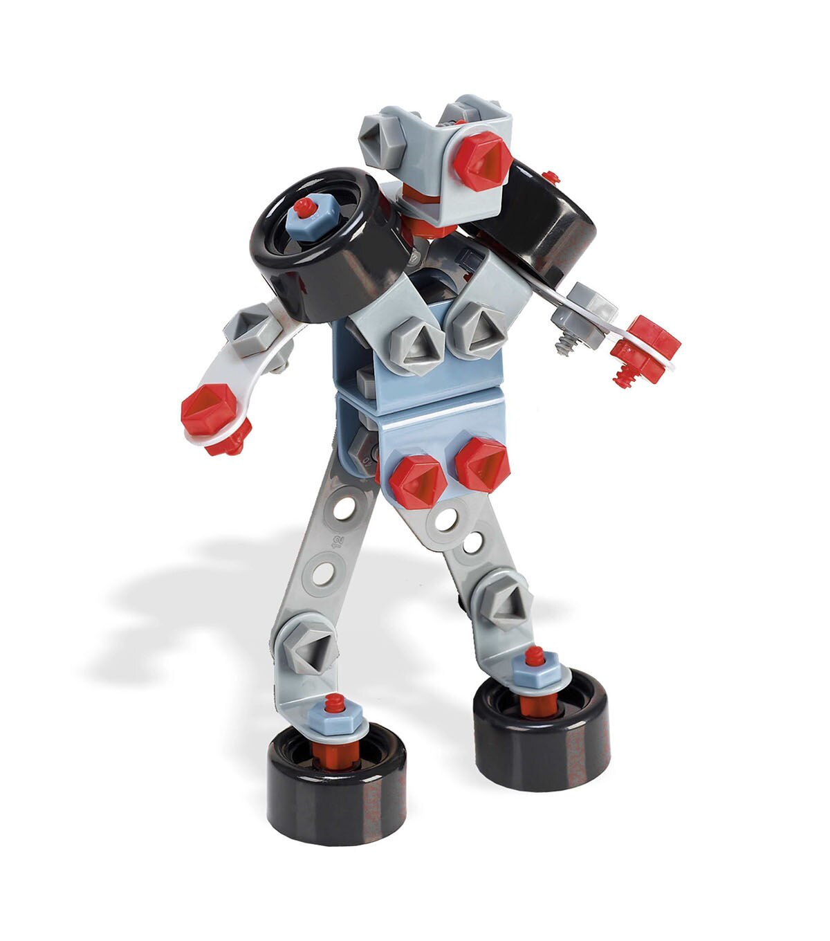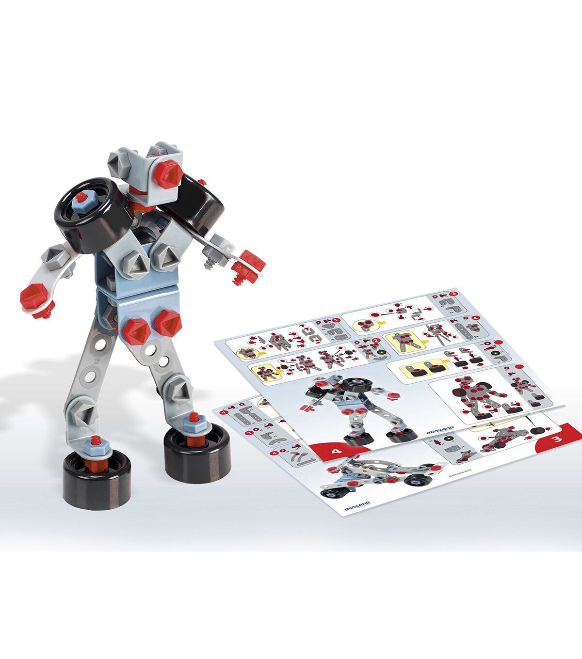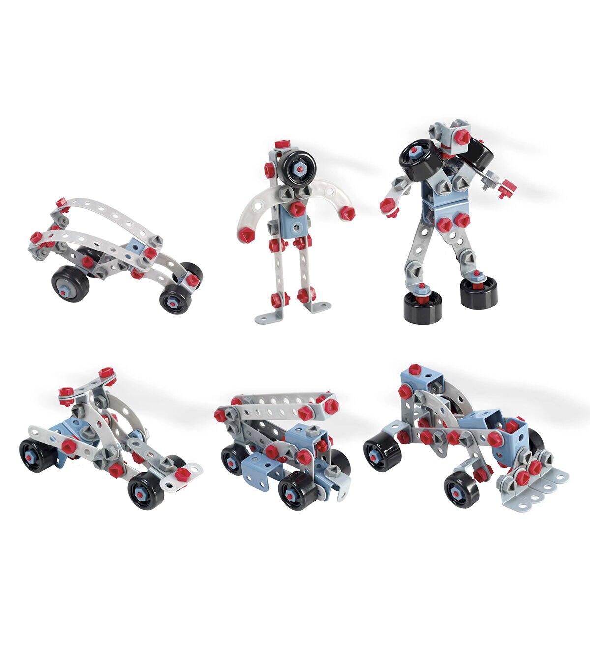 Game of mechanical constructions with multiple assembly possibilities. It includes several formats of flexible platelets, pins, shafts, screws and nuts and various wheel sizes. The combination of all of them multiplies the possibilities of building pieces of varying complexity according with the wit.