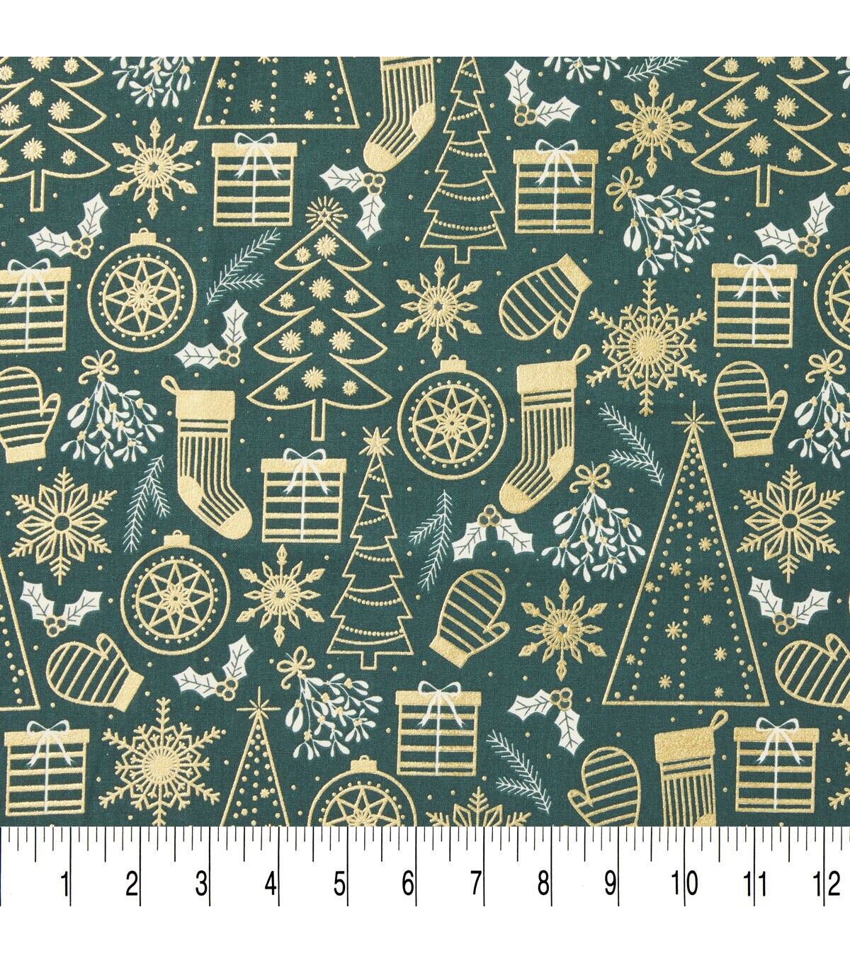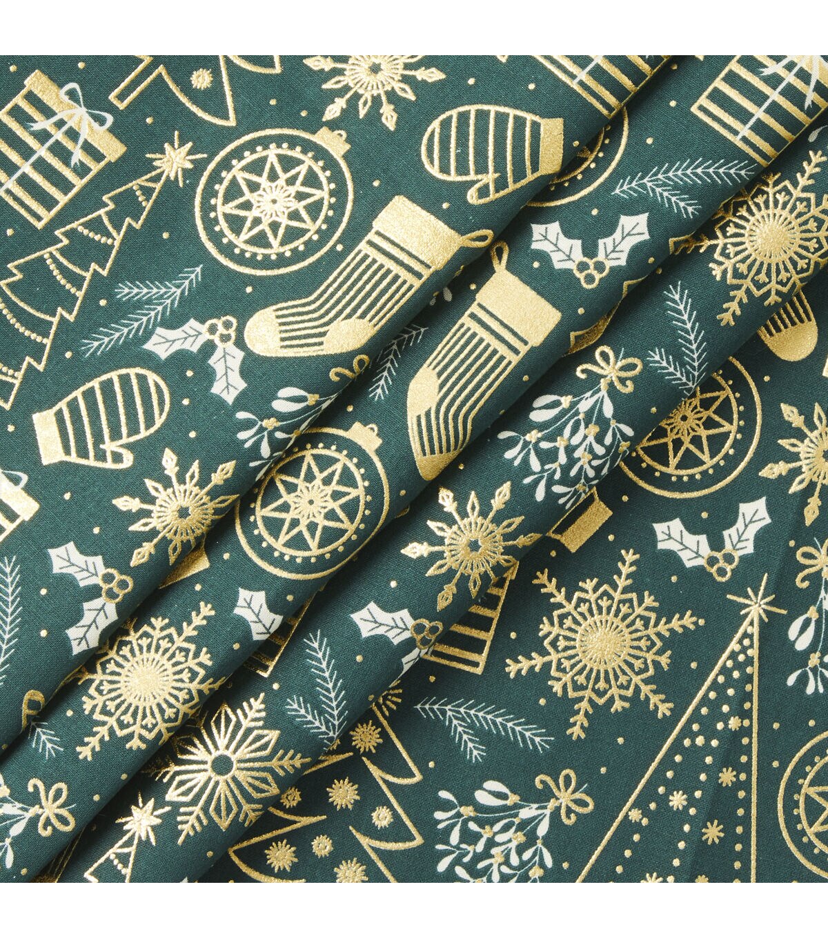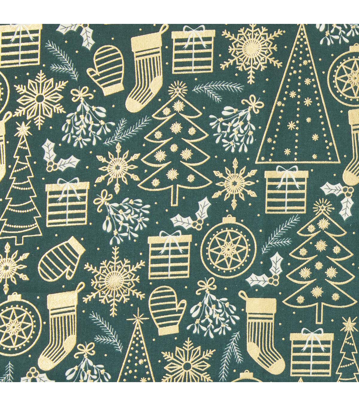 Get into the Holiday Spirit with Mittens & Stockings on Green Christmas Foil Cotton Fabric