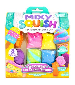 - Open up your own Mixy Squish Scented Ice Cream Shoppe with 4 sweet-smelling clays in tons of different colors and textures including marbled green apple, blueberry glitter, strawberry sprinkles, and vanilla rainbow! Press the Mixy Squish into the provided molds to transform them into an ice cream cone or a popsicle! Then, use the sculpting tools to add super-sweet details, like sprinkles, smiles, and more!