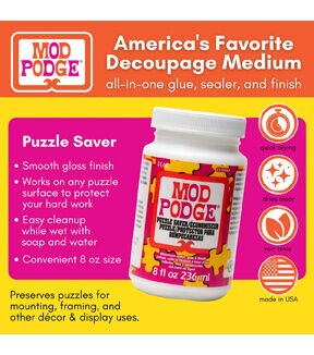 CRAFT-Mod Podge Puzzle Saver. Use this mod podge to hold your favorite puzzle together! You can apply coats to the front and back for extra hold; then put it into a frame to display it! This package contains 8oz of puzzle saver. Conforms to ASTM D 4236. Made in USA.