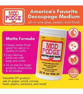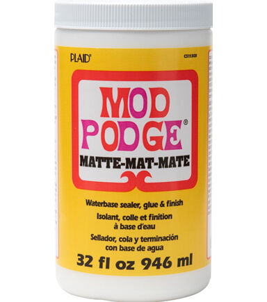 MOD PODGE-Matte Finish in a 32 ounce plastic bottle with a closable squeeze top. The waterbase sealer, glue and finish for all surfaces. Non toxic, non flammable. Conforms to ASTM D 4236.