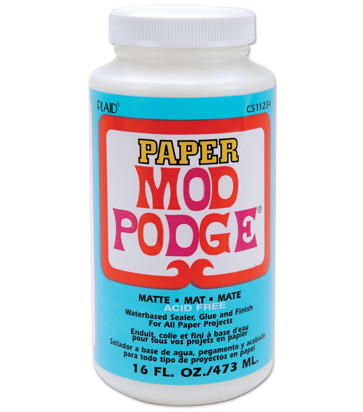 MOD PODGE-16 fluid ounces of paper mod podge. Matte and acid free. Waterbased sealer, glue, and finish. Non-toxic, non-flammable, acid free, and non-tacky. Keep at room temperature. Clean up with water while wet. Conforms to ASTM D4236. Plaid Limited Warranty.