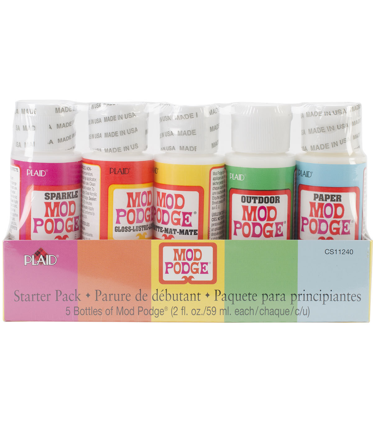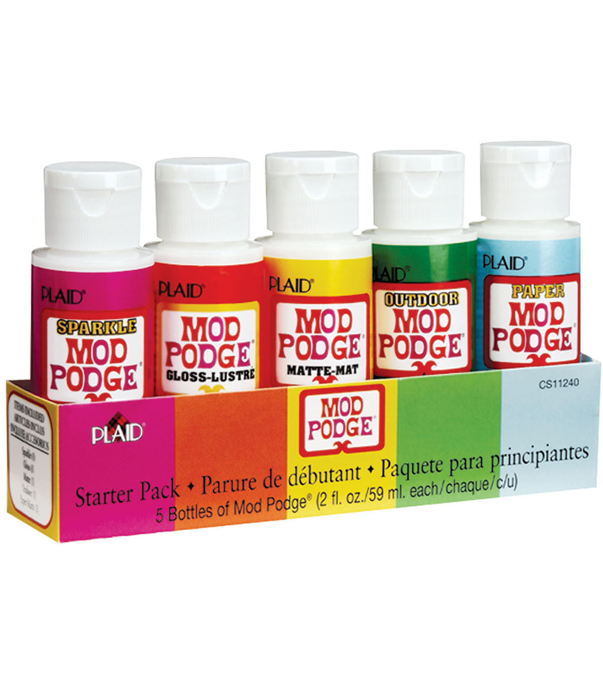 Use the Mod Podge Starter Set to lend a fun and unique look to every craft project. This all in one water-based sealer, glue and finish is quick-drying and is easily sanded to a smooth matte finish. The pack contains 5 bottles of mod podge for five different purposes like sparkle, gloss, matte, outdoor and paper.
