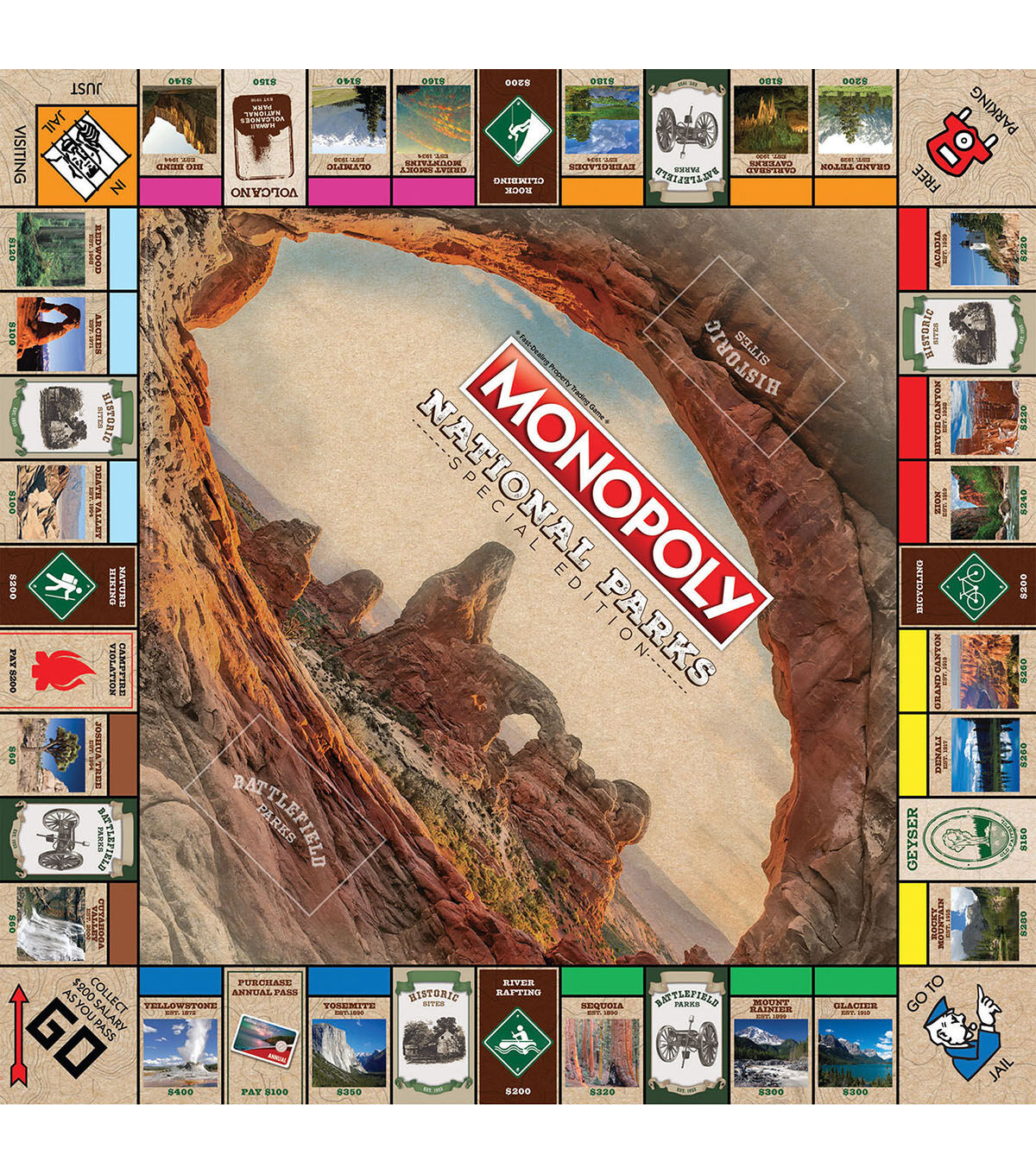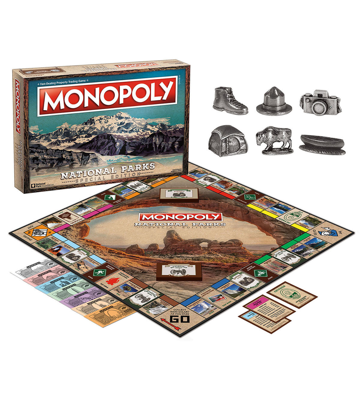 Celebrate the beauty of America’s National Park system with Monopoly National Parks Edition Board Game. The game features over 60 of the most beautiful and historic sites in America from the stunning landscape of the Grand Canyon to the awe-inspiring wonder of Yellowstone. It also features animals that call the national parks home. This game includes a custom game board featuring 60 National Parks including Yellowstone, Yosemite, Sequoia and more. It also has custom money bills featuring national monuments including the White House, Thomas Jefferson Memorial, Lincoln Memorial, Washington Monument, Mount Rushmore, Statue of Liberty and the Devil’s Tower. This game comes with six collectible tokens including a ranger hat, tent, canoe, bison, hiking boot and camera. It is an educational and fun game for the whole family that promotes logic and monetary skills.