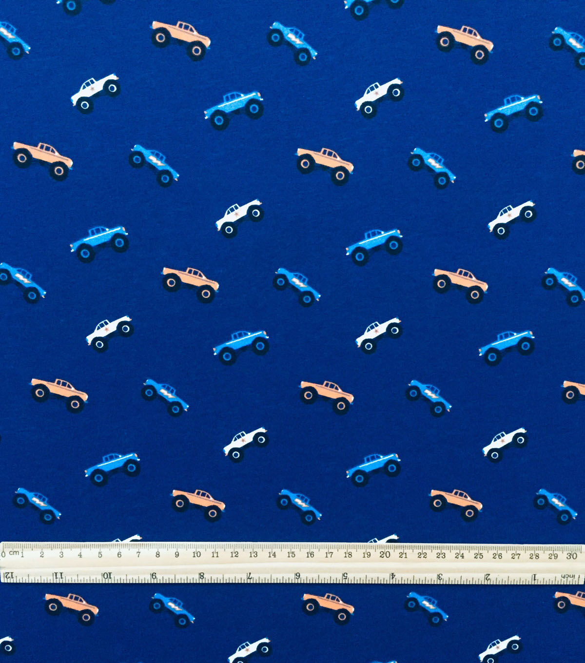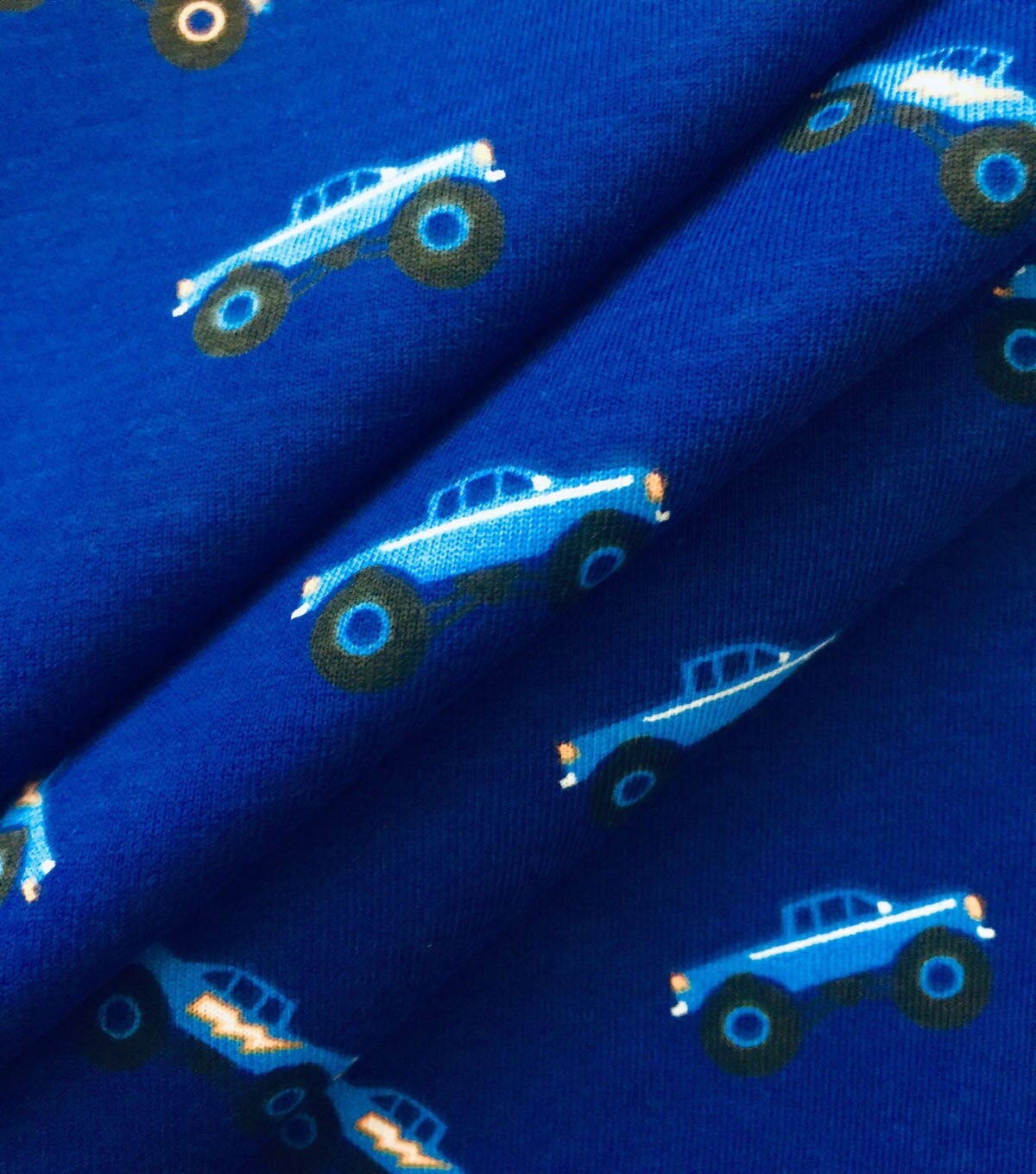 Don't settle for boring fabrics when you can add a touch of excitement to your next project with Monster Trucks on Blue Jersey Knit Fabric. Order now and let your creativity run wild!