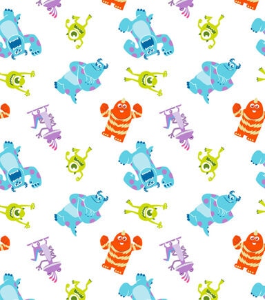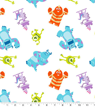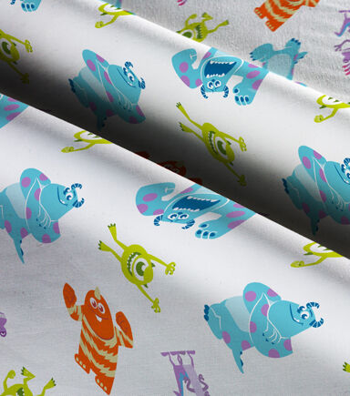 This Monsters Inc Friend Toss is a super colorful and fun fabric with all your favorite characters in Monsters Inc such as Sully, Mike Wazowski, Randall, and George. This fabric would be great to use for a throw blanket or pillow covers. It is 100% cotton and machine washable.