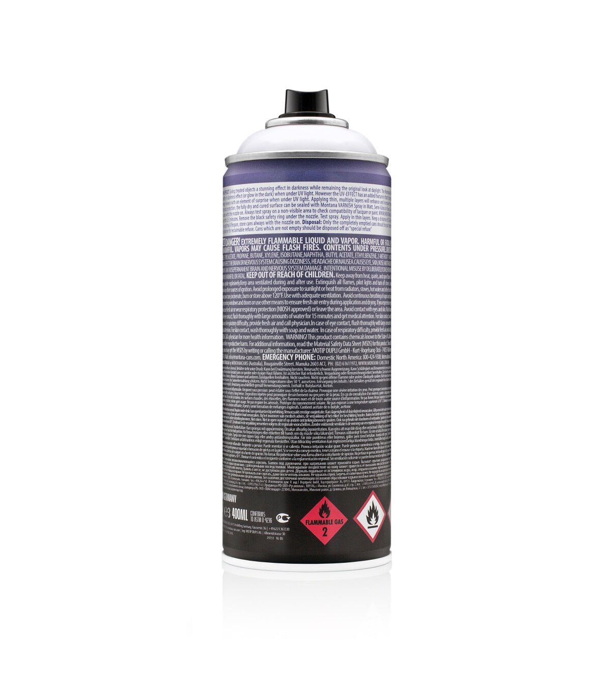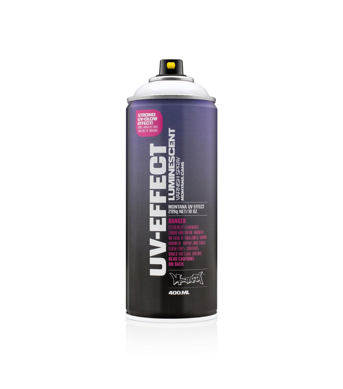 Montana Cans UV-EFFECT is a transparent effect paint that is only visible under direct UV light. This EFFECT paint is able to be applied on almost any surface. The colorless and semi-gloss paint is not visible in sunlight, but illuminates when exposed to UV light with a glowing, blue-purple color.