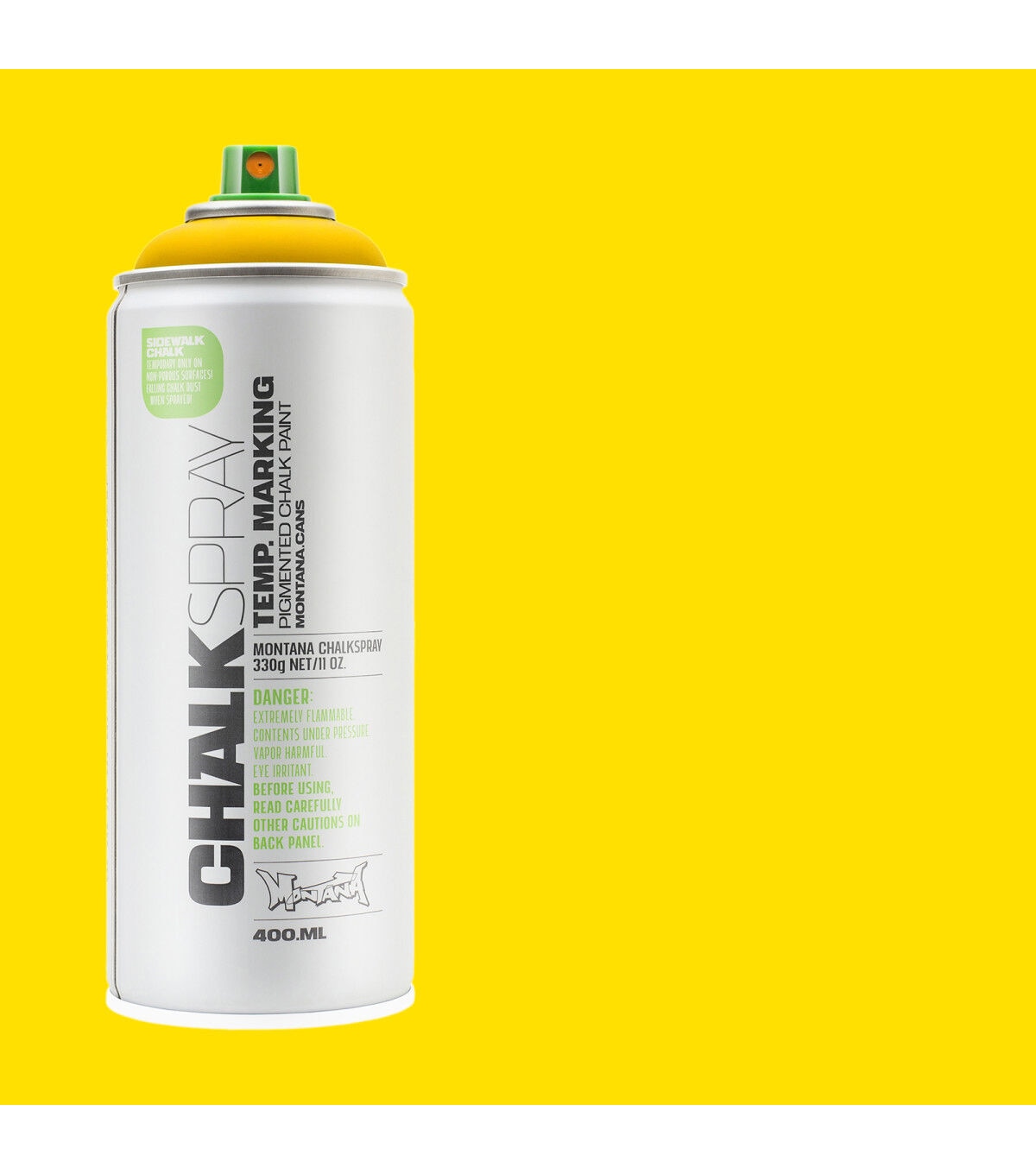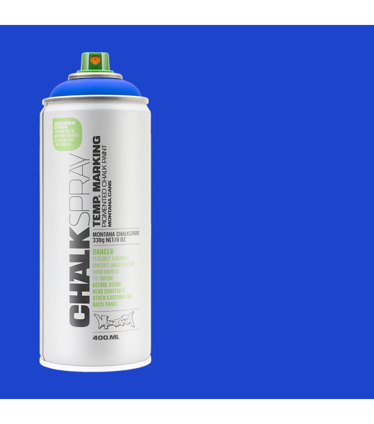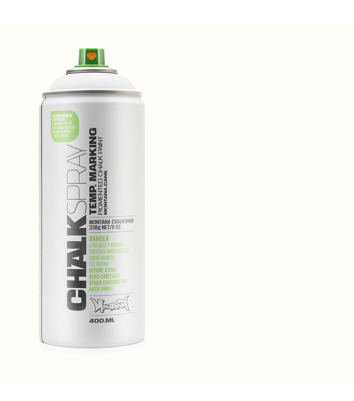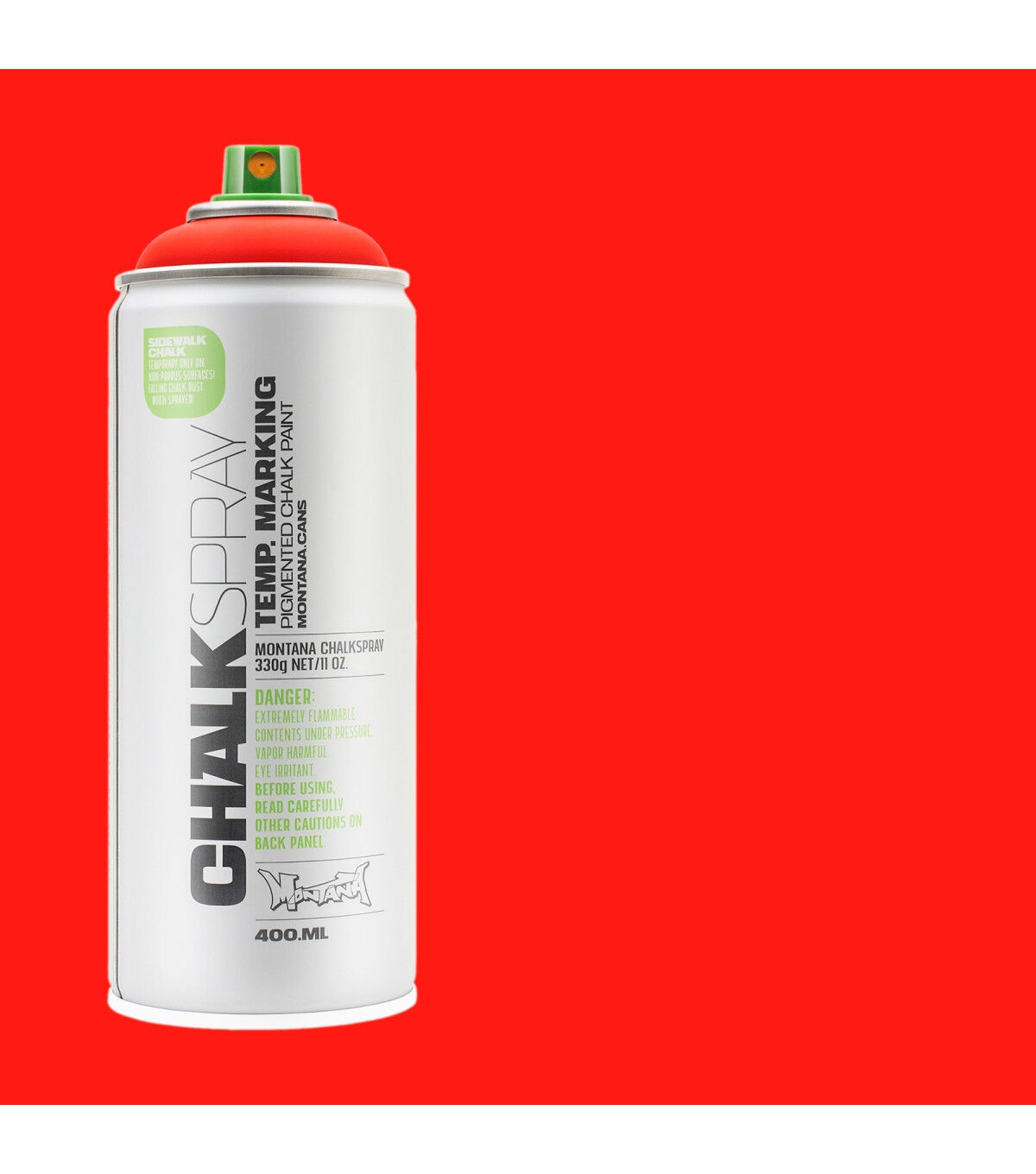 This Montana Chalk Spray has the look and feel of a rough chalk effect, ideal for temporary outdoor markings on non-porous surfaces as well as for indoor studio artwork. This is a great medium for signage for events, advertisements, marketing campaigns and outdoor activities. Apply this spray on various surfaces such as sidewalks, walls, cardboard and canvas. The chalk markings will last from several weeks to several months, depending on climate and weather conditions. The chalk color pigments will wash away faster on non-porous surfaces like glass or metal, but some pigments may remain on porous surfaces.