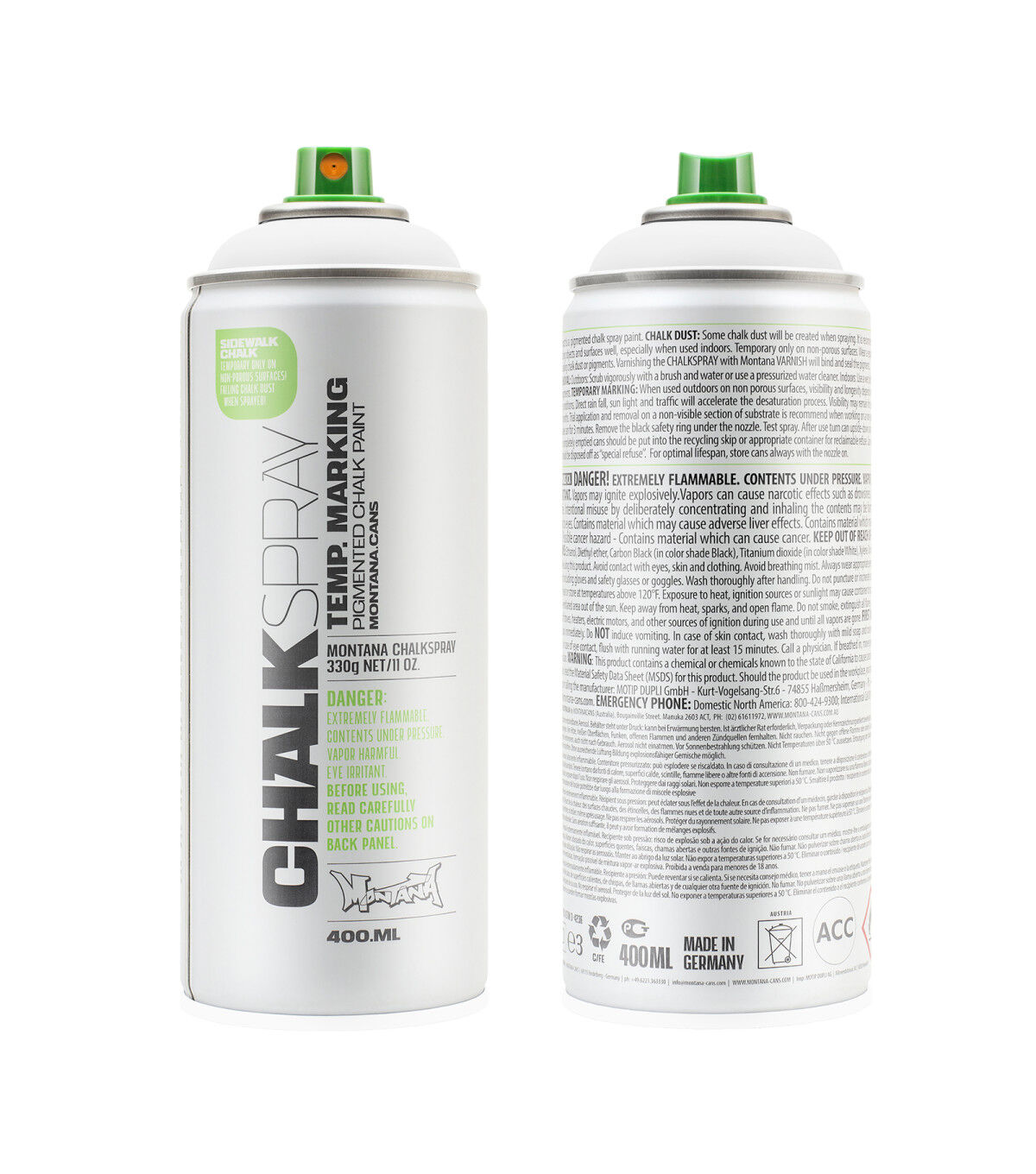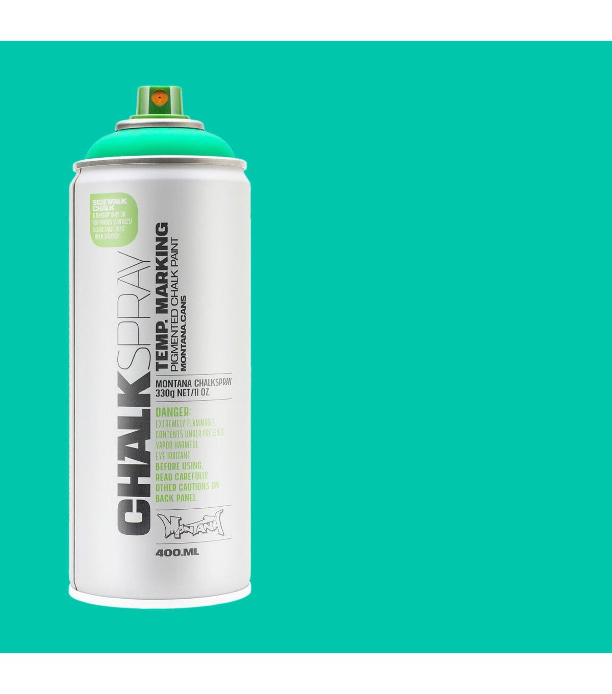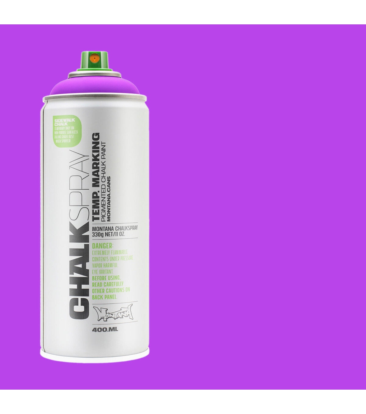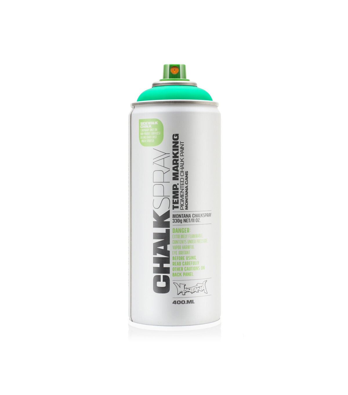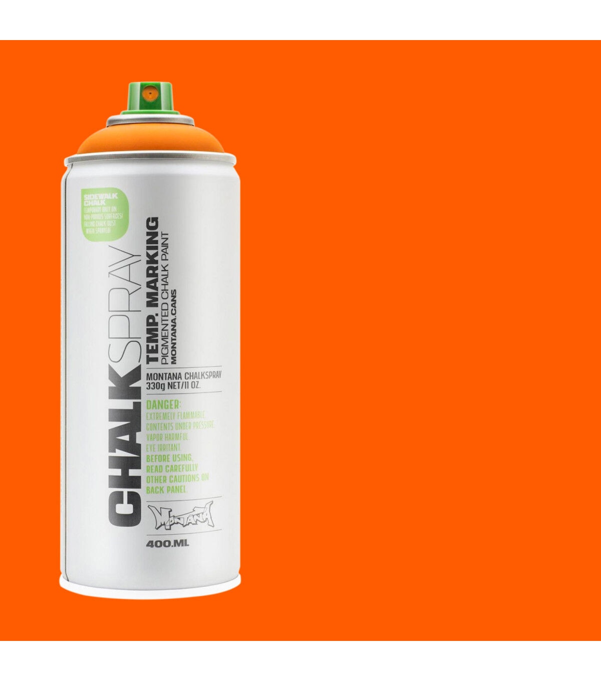 This Montana Chalk Spray has the look and feel of a rough chalk effect, ideal for temporary outdoor markings on non-porous surfaces as well as for indoor studio artwork. This is a great medium for signage for events, advertisements, marketing campaigns and outdoor activities. Apply this spray on various surfaces such as sidewalks, walls, cardboard and canvas. The chalk markings will last from several weeks to several months, depending on climate and weather conditions. The chalk color pigments will wash away faster on non-porous surfaces like glass or metal, but some pigments may remain on porous surfaces.