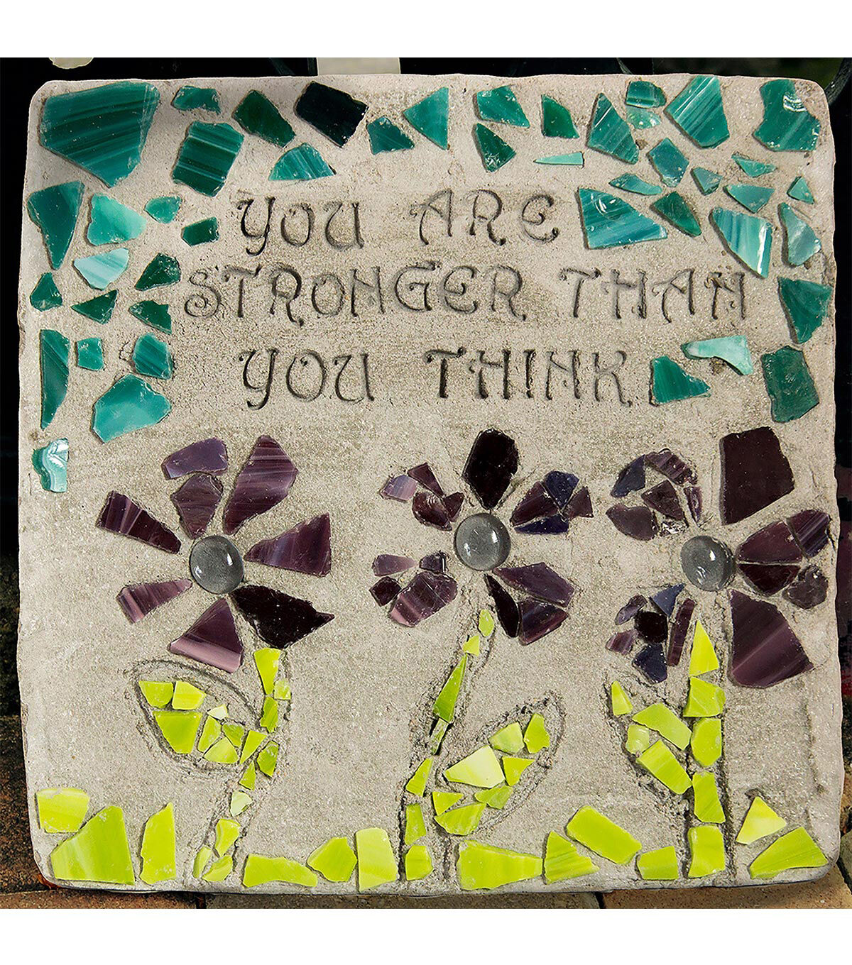 Add inspiration to any garden with this charming mosaic stone. Finished dimensions are approximately 12'' x 12''.