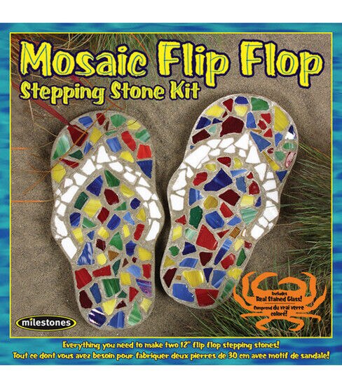 MILESTONE-Everything you need to make two 12 inch flip flop stepping stones! Kit contains 2-3 5 pound bags stepping stone mix, 2 12 inch reusable plastic molds, 1 pound stained glass mosaic pieces, 1 wooden mixing paddle, 1 craft stick for writing, design template and easy to follow instructions.