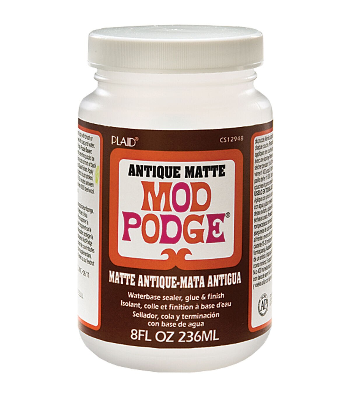 PLAID-Mod Podge: Antique Matte. The versatile sealer; glue and finish you know and love in an antique matte finish. It can be used on all surfaces and is non-toxic. This package contains one 8 fl.oz. bottle of Mod Podge Antique Matte. Conforms to ASTM D-4236. Made in USA.