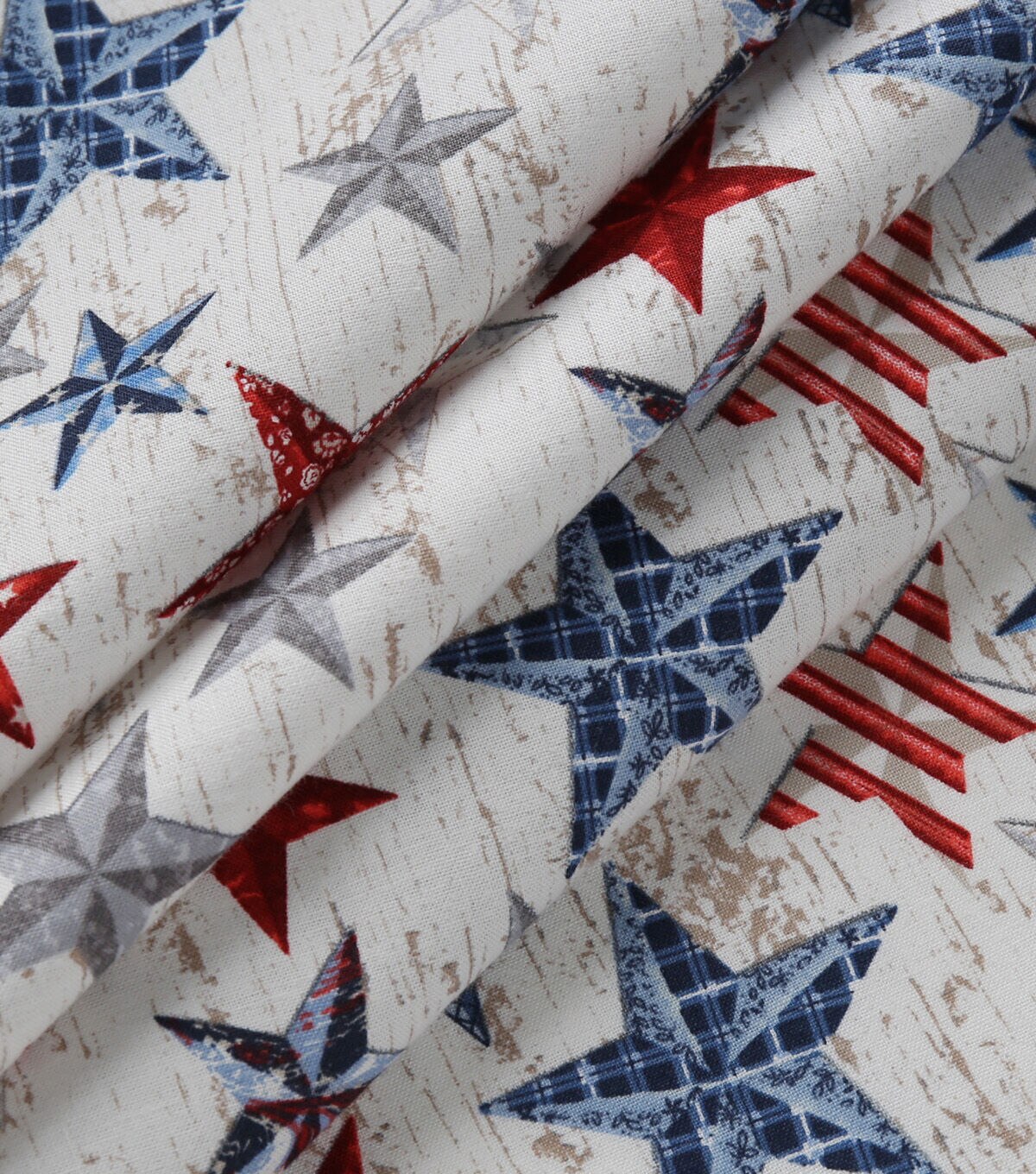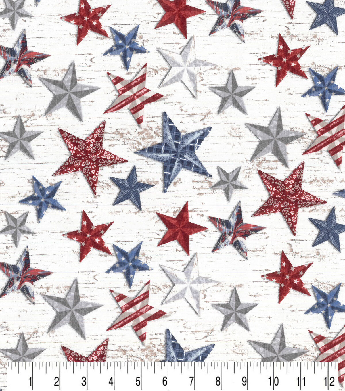 Multi Colored Stars on White Plank Patriotic Cotton Fabric