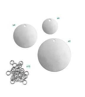 - Includes: (4) Circle w/ Hole, 1/2", Aluminum, 16ga (4) Circle w/ Hole, 3/4", Aluminum, 16ga (4) Circle w/ Hole, 1", Aluminum, 16ga (15) Jump Rings, 7mm, Silver Plated, 20ga