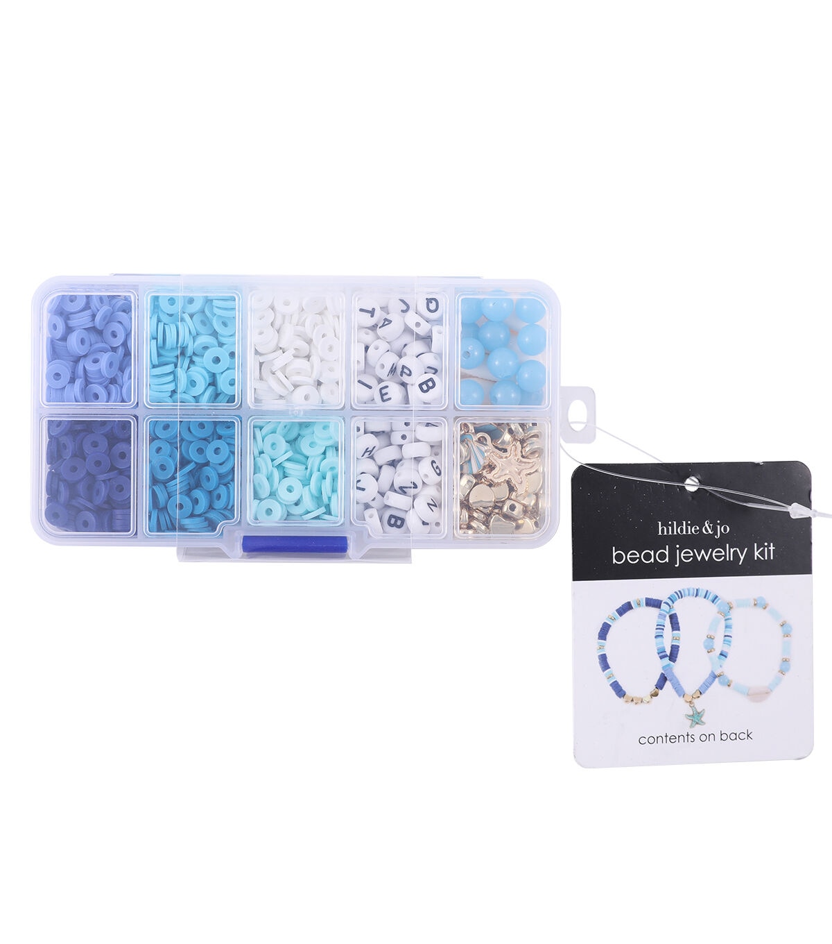 Create beautiful jewelry pieces using the Multi Size Spring Beachy Blues Bead Kit by hildie & jo. This box comprises spacer beads in shades of blue, alphabet beads, round beads, gold-toned heart-shaped beads and charms. You can use them to create necklaces, bracelets, keychains and more. They will also be perfect to adorn bags, hair accessories and more.