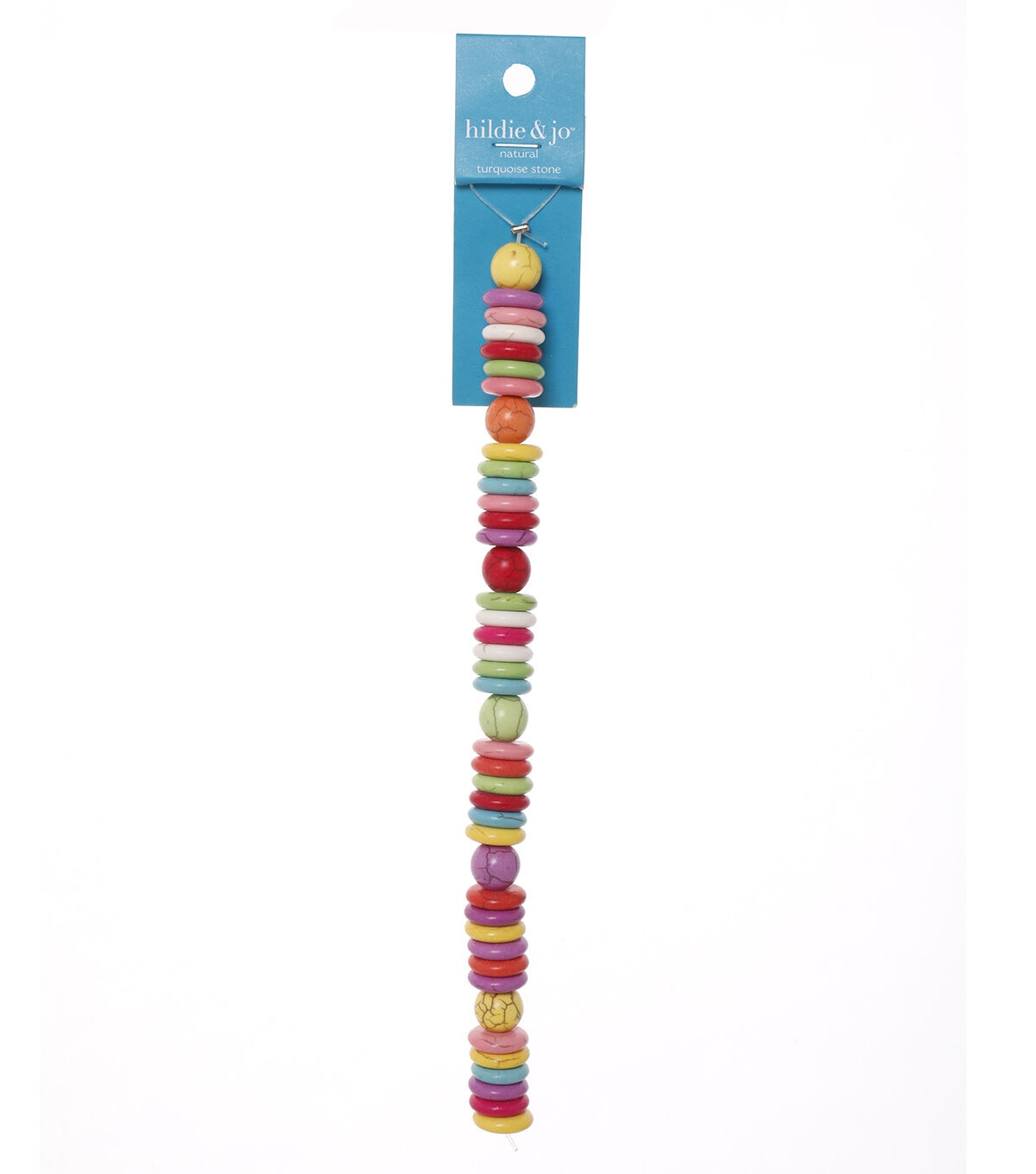 The hildie & jo Fiesta Turquoise Stone Deco Bead Strand - Multi will make a great addition to your little one's jewelry-making kit. This strand includes beads sporting multicolored hues. Team these beads with cords, findings, charms and beads to create beautiful necklaces, bracelets and more. You can use them as is or team them with beads in coordinating hues.