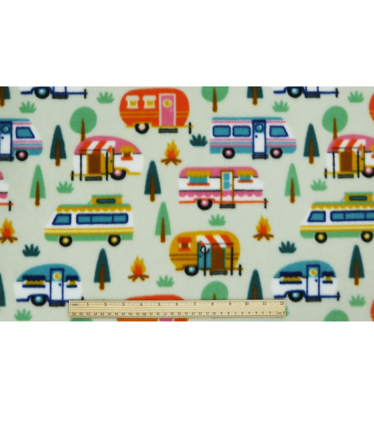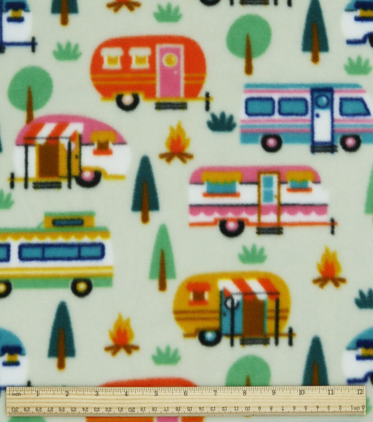 Multiple Campers on Green Anti Pill Fleece Fabric