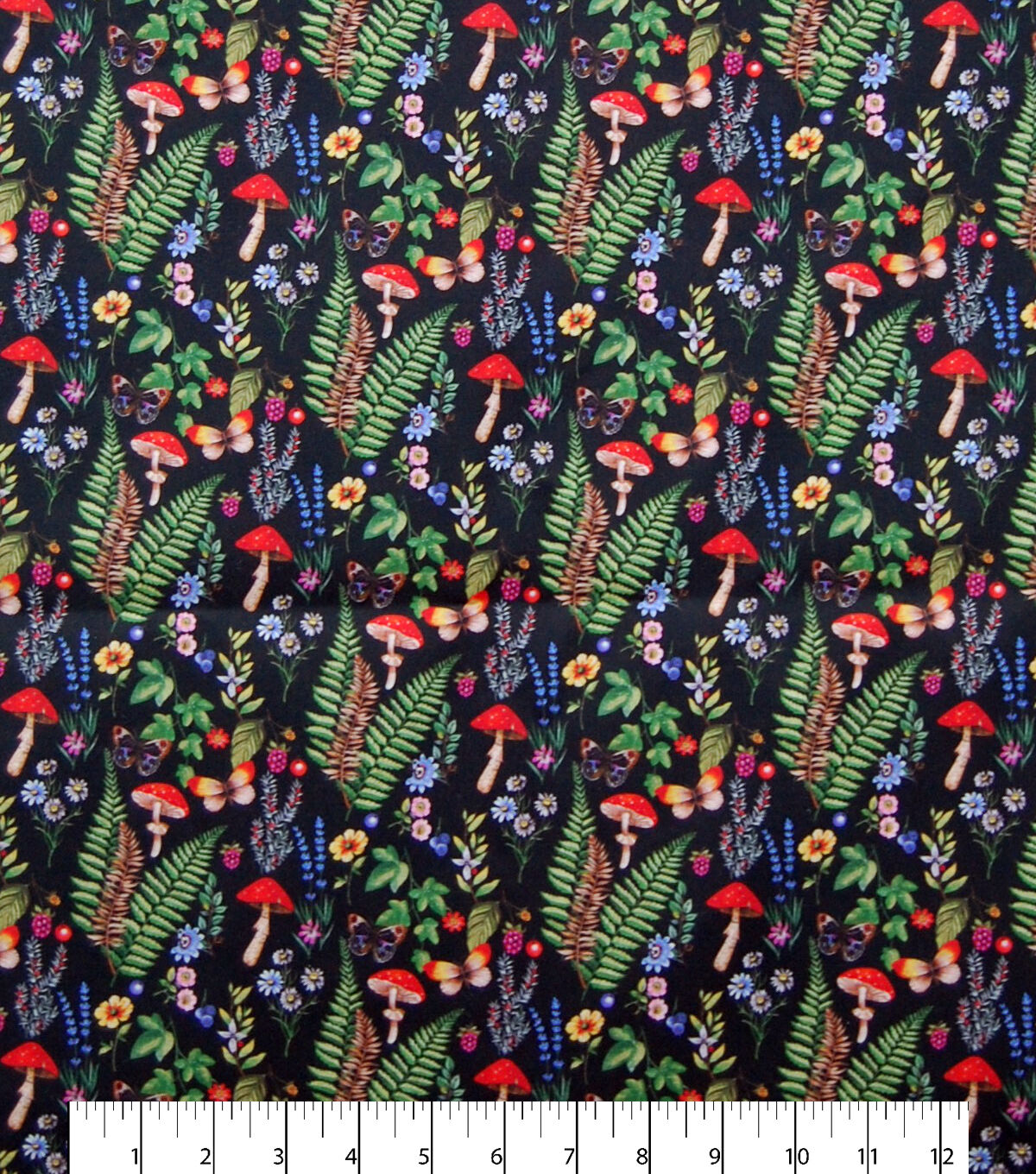 Mushroom Garden on Black Cotton Fabric by Keepsake Calico