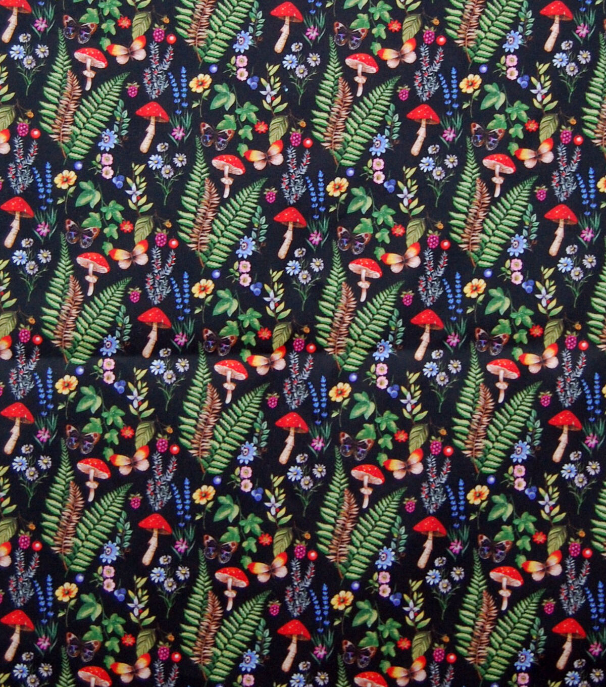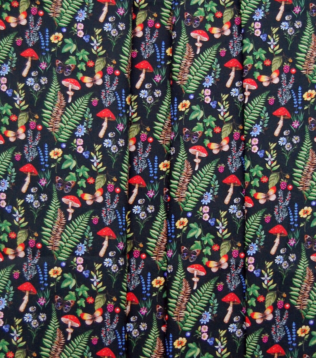 • Mushroom Garden on Black Cotton Fabric by Keepsake Calico