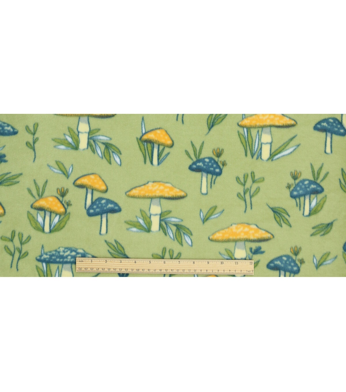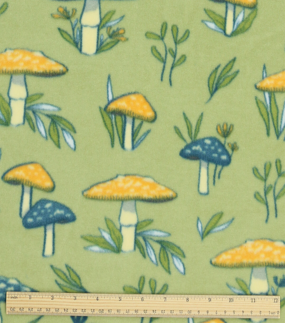 Get Cozy with Mushrooms & Leaves on Green Anti Pill Plush Fleece Fabric