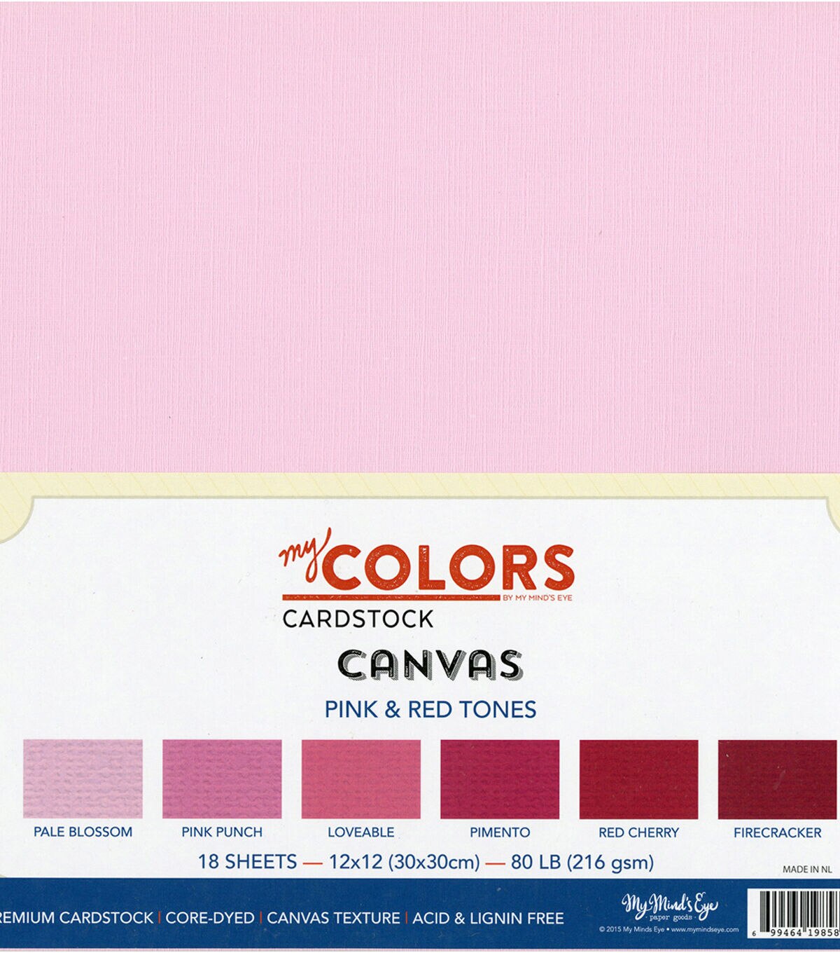 Bring the perfect start to your next card making, scrapbooking and various mixed media projects with My Mind's Eye My Colors Canvas Premium Cardstock-Pink & Red Tones. Use these cardstock sheets to add a customized touch to your DIY paper craft creations. The pack contains eighteen, 12 x 12-inch premium quality, canvas texture sheets with a smooth finish. These cardstock sheets are available in six different colors, three of each, and are acid and lignin free.