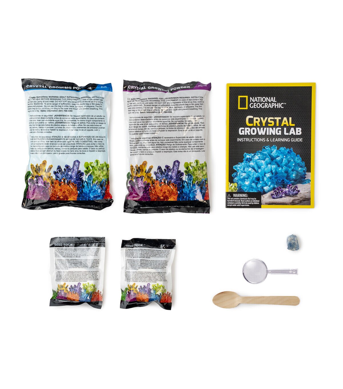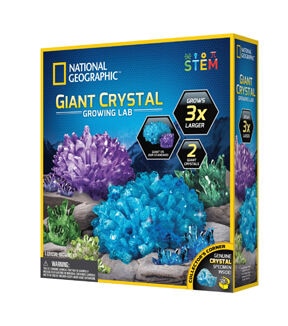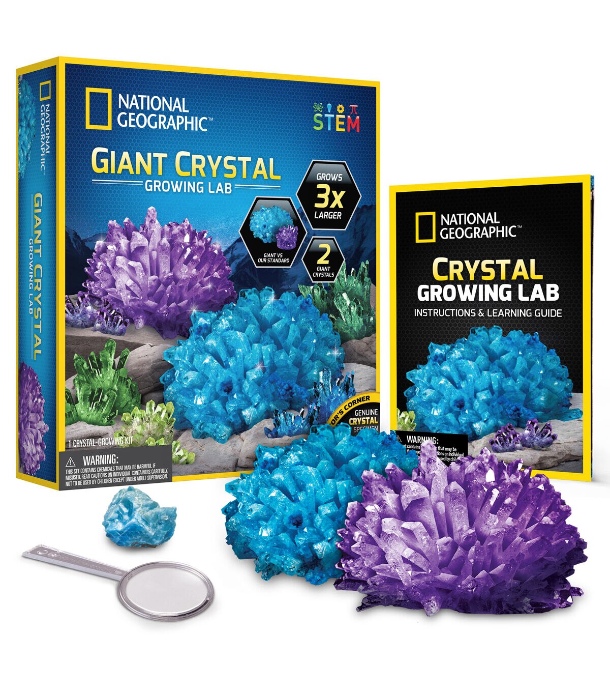 Grow two massive crystals with the National Geographic Giant Crystal Growing Lab! These crystals are three-times larger than our standard crystals and grow fully in just a few days. Your kids will be astounded as they watch these crystals take shape and will learn the science behind crystal formation in our detailed, full-color learning guide. This kit also includes a magnifying glass and real crystal specimen.