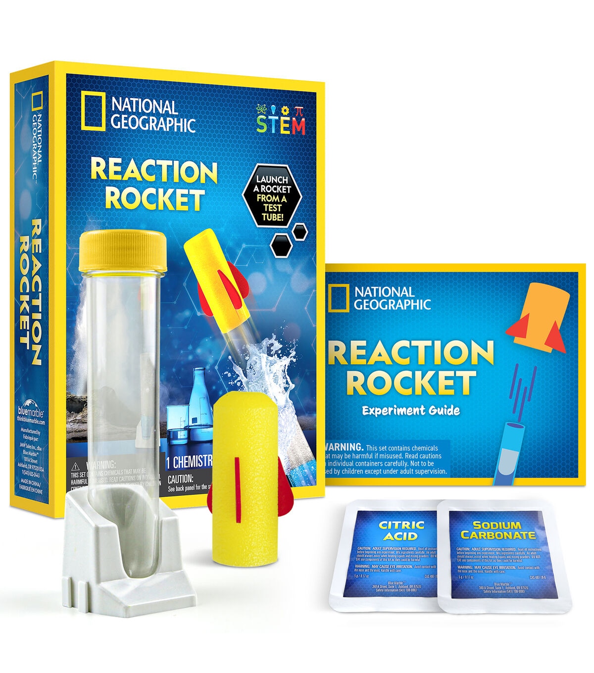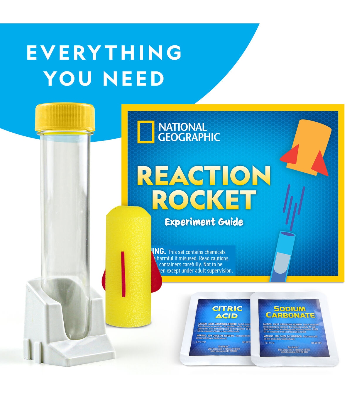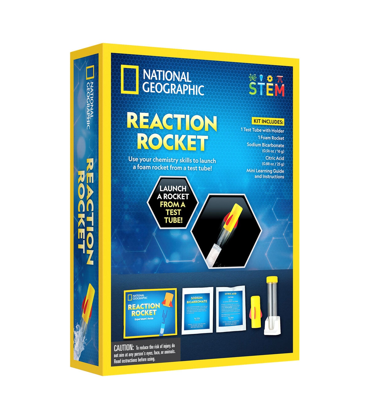 Send a foam rocket soaring with the National Geographic Reaction Rocket! This exciting kit has everything kids need to launch a foam rocket using science! Easy-to-follow instructions make the activity super fun and easy. Plus, kids will learn about the chemical reaction happening inside the test tube that launches the rocket into the sky. Get the Reaction Rocket today!