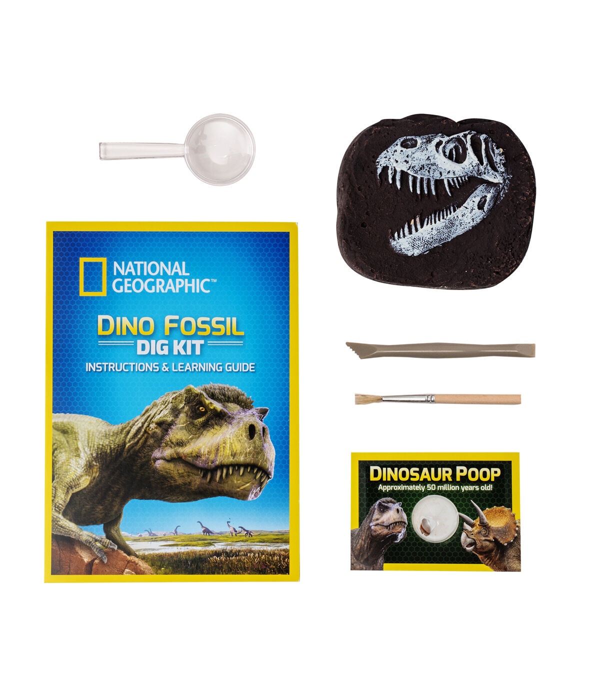 Kids will use the chisel and brush provided in the kit to find a hidden T.rex tooth replica inside the dig. A magnifying glass is also included so kids can get an up-close look at the tooth, and they will learn more about fossils and paleontology in the detailed learning guide.