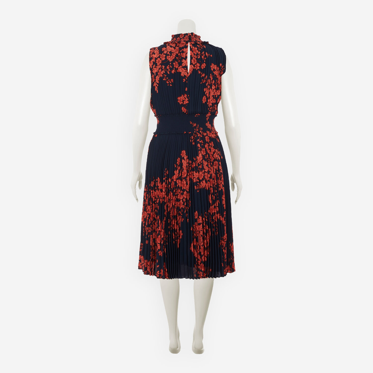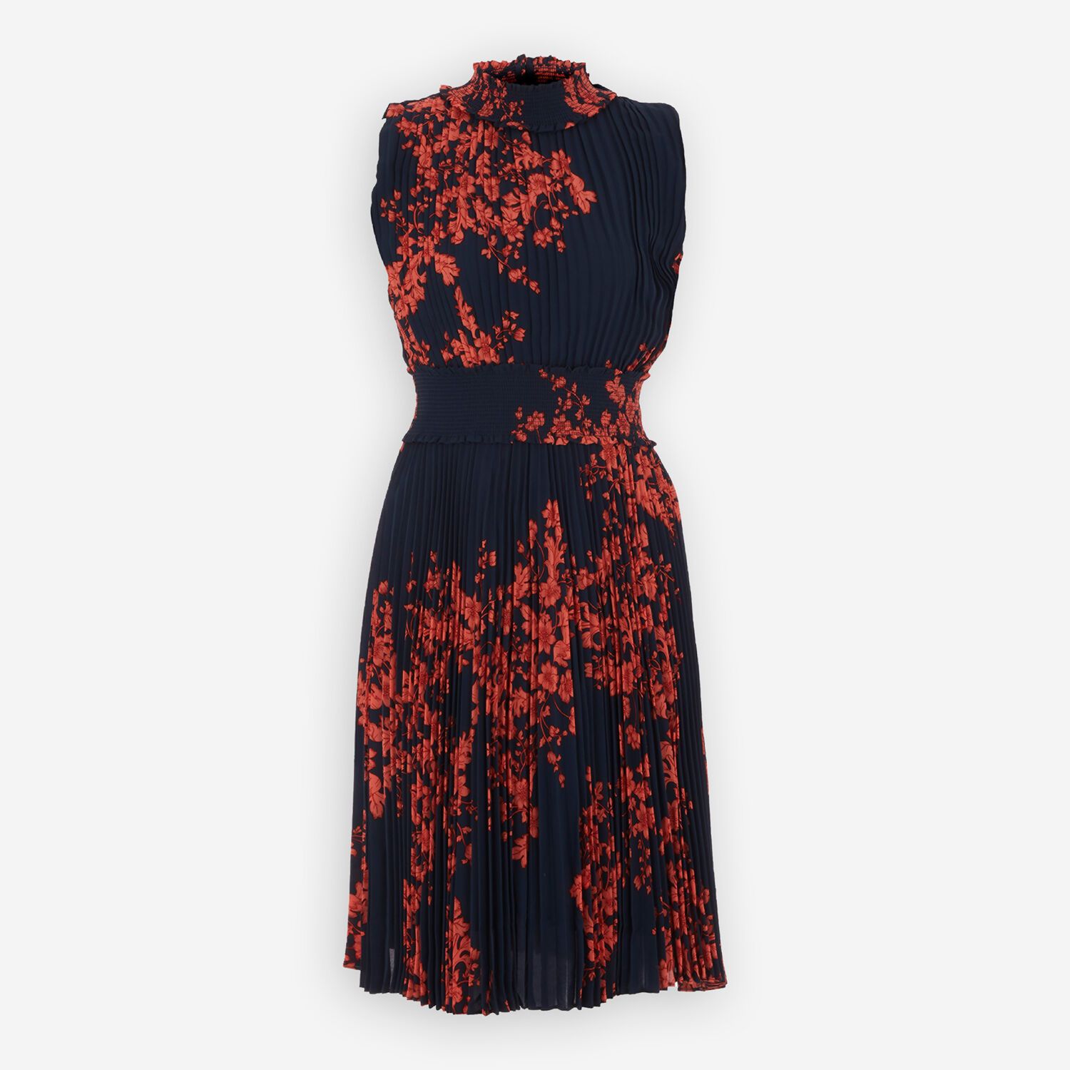 • Navy & Coral Pleated Midi Dress