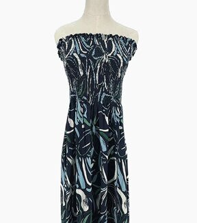 Transform your wardrobe with this stunning Navy Large Paint Floral Smocked Rayon Challis Fabric. This fabric is perfect for creating a strapless smock dress with just one seam up the middle. The customizable length allows you to wear it as a maxi dress or shorten it to make a mini/midi dress or even a summer blouse. You can use the fabric removed from the hem to create sleeves or add ruffles to the hem. The possibilities are endless with this versatile fabric.