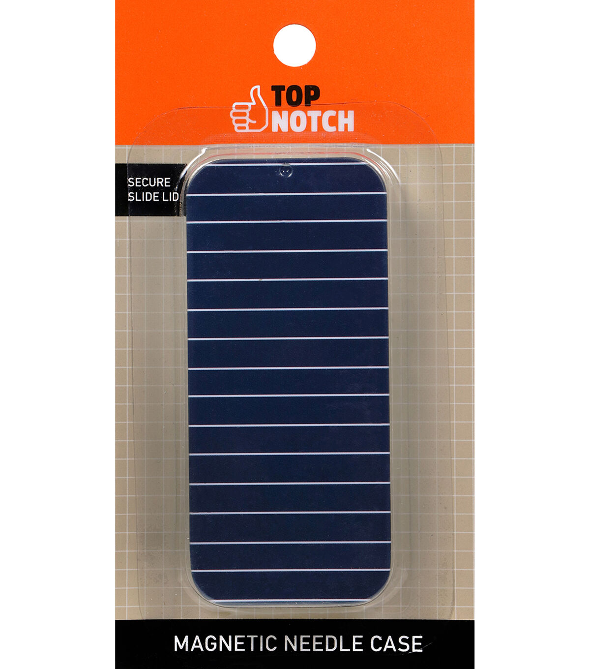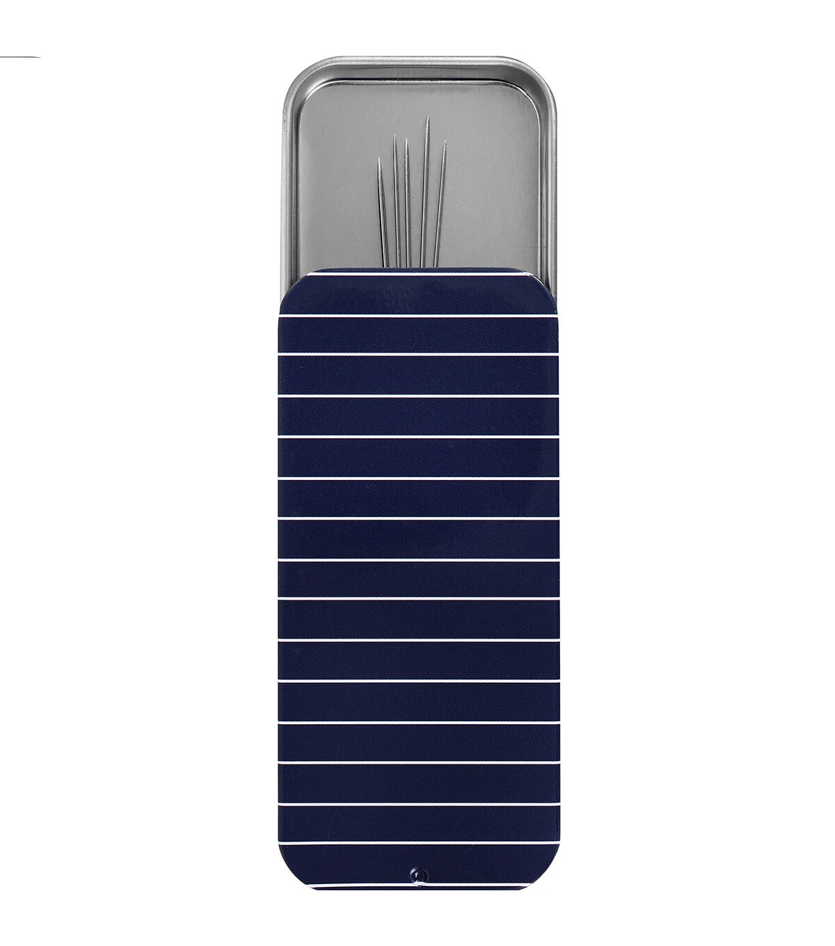 - The Top Notch Magnetic Pin and Needle Storage Case with Stripe Design is a fashionable way to store and transport your needles and pins. Measuring 3.625” by 1.625” and 0.5” deep, this needle holder is both stylish and functional. Its metal case has a strong magnet to collect and safeguard pins and needles. The stylish lid is navy with a white stripe design. It slides open and can be fully removed from the needle case, then closes again with a secure click to contain and store your pins. Use it to store straight pins, safety pins, sewing machine needles, or hand sewing needles - or buy one for each type of pin you need! This adorable case keeps your sewing supplies neat and organized. A fashionable addition to any seamstress’s sewing kit, this needle case can also be tossed into a purse for mending on the go. Pins and needles sold separately.