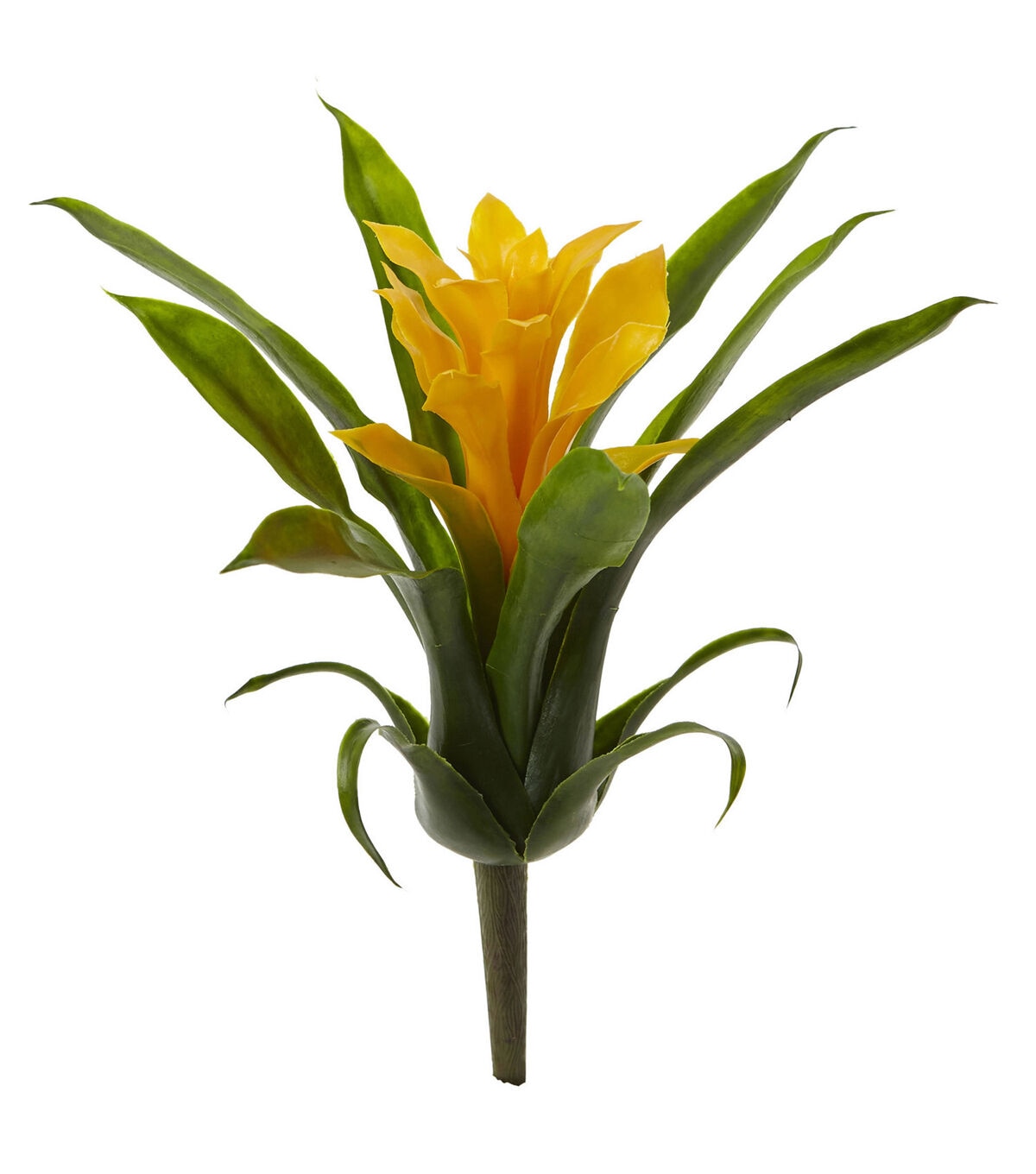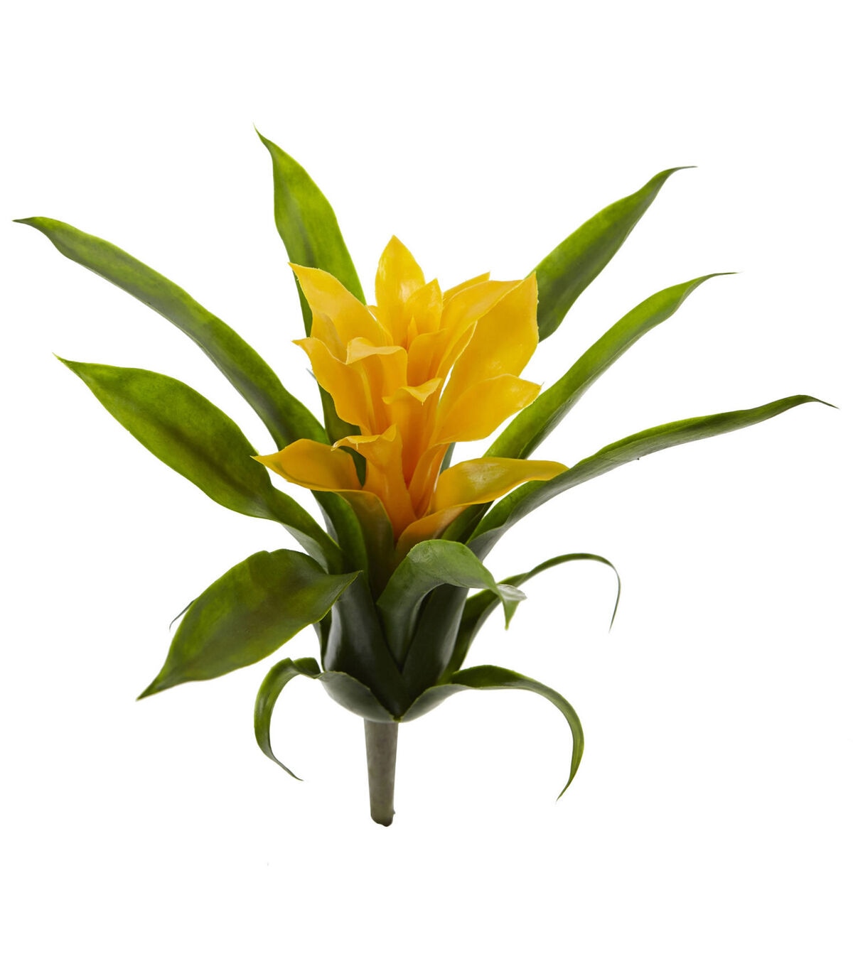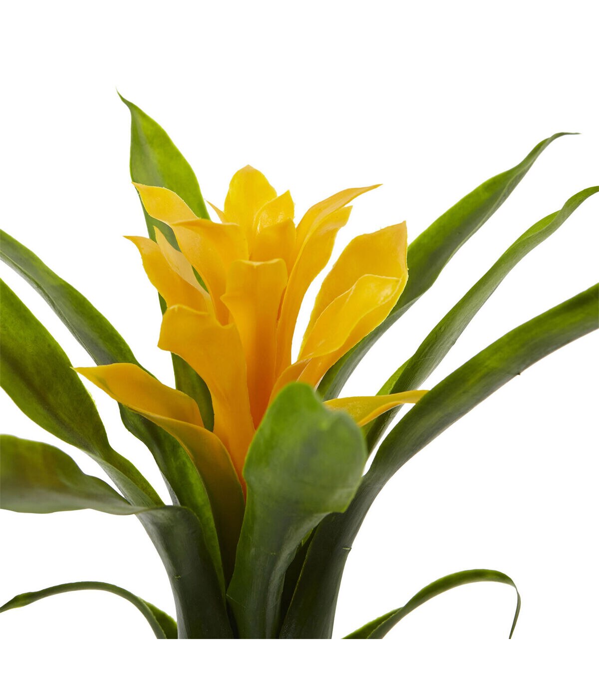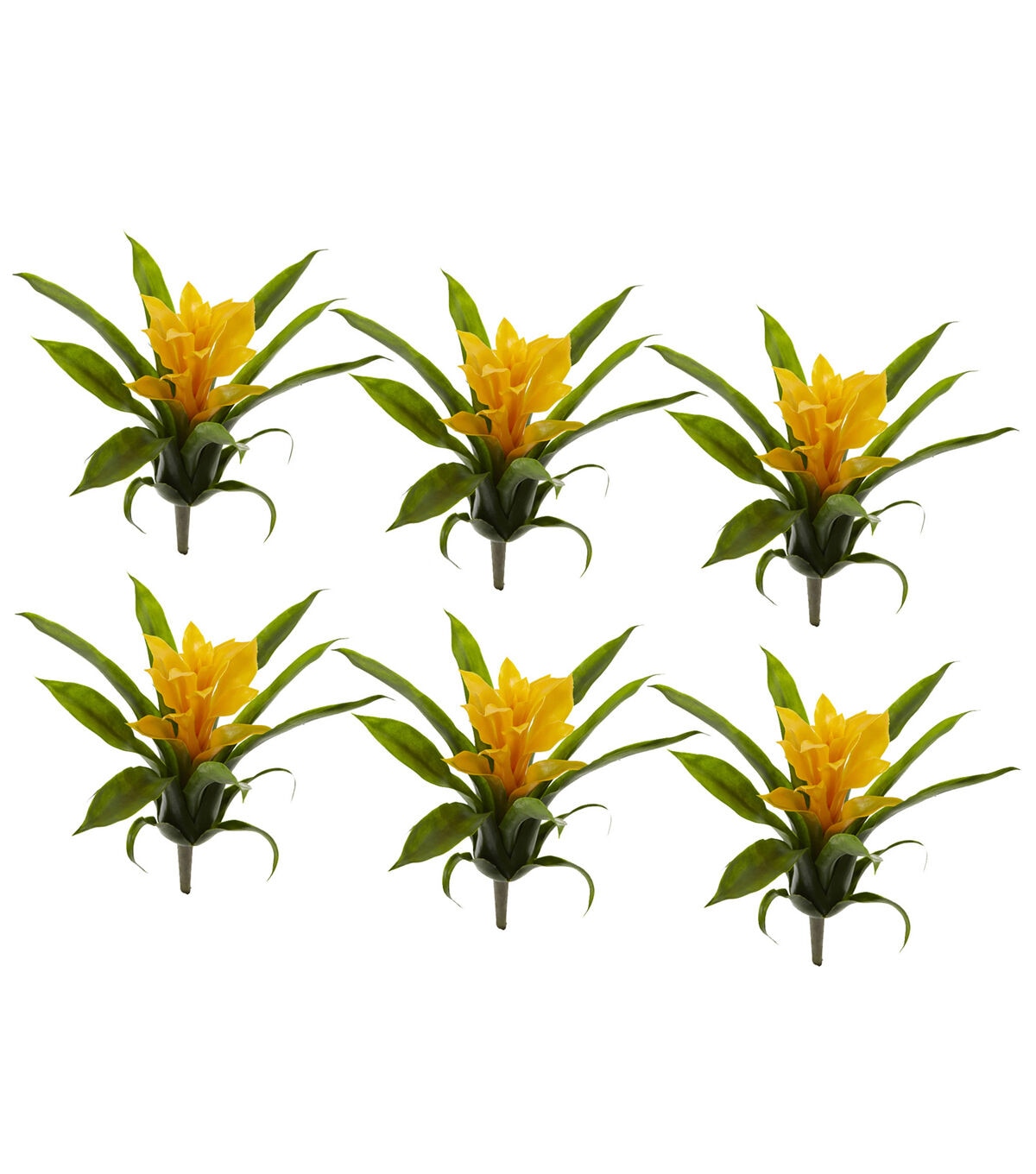 The lush green leaves of the bromeliad bush open to reveal a brilliant bloom. Like a small pocket of color, it looks stunning against the backdrop of a window pane. This lifelike plant is ideal for any room. Arrives with 6 bushes.