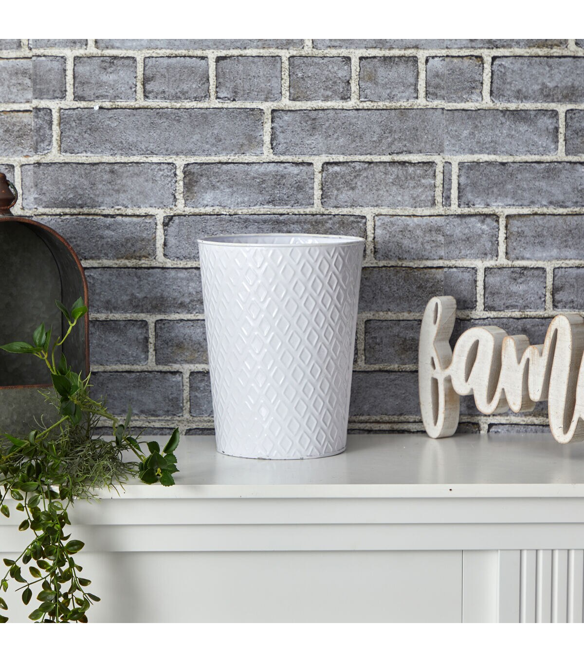 What better way to add a contemporary and classical touch to your space than with an embossed white tin planter? Simple yet brings a ton of texture and style; this planter is an excellent way to spruce up your space - it's perfect for those minor changes. Standing 10" to house any faux plant.