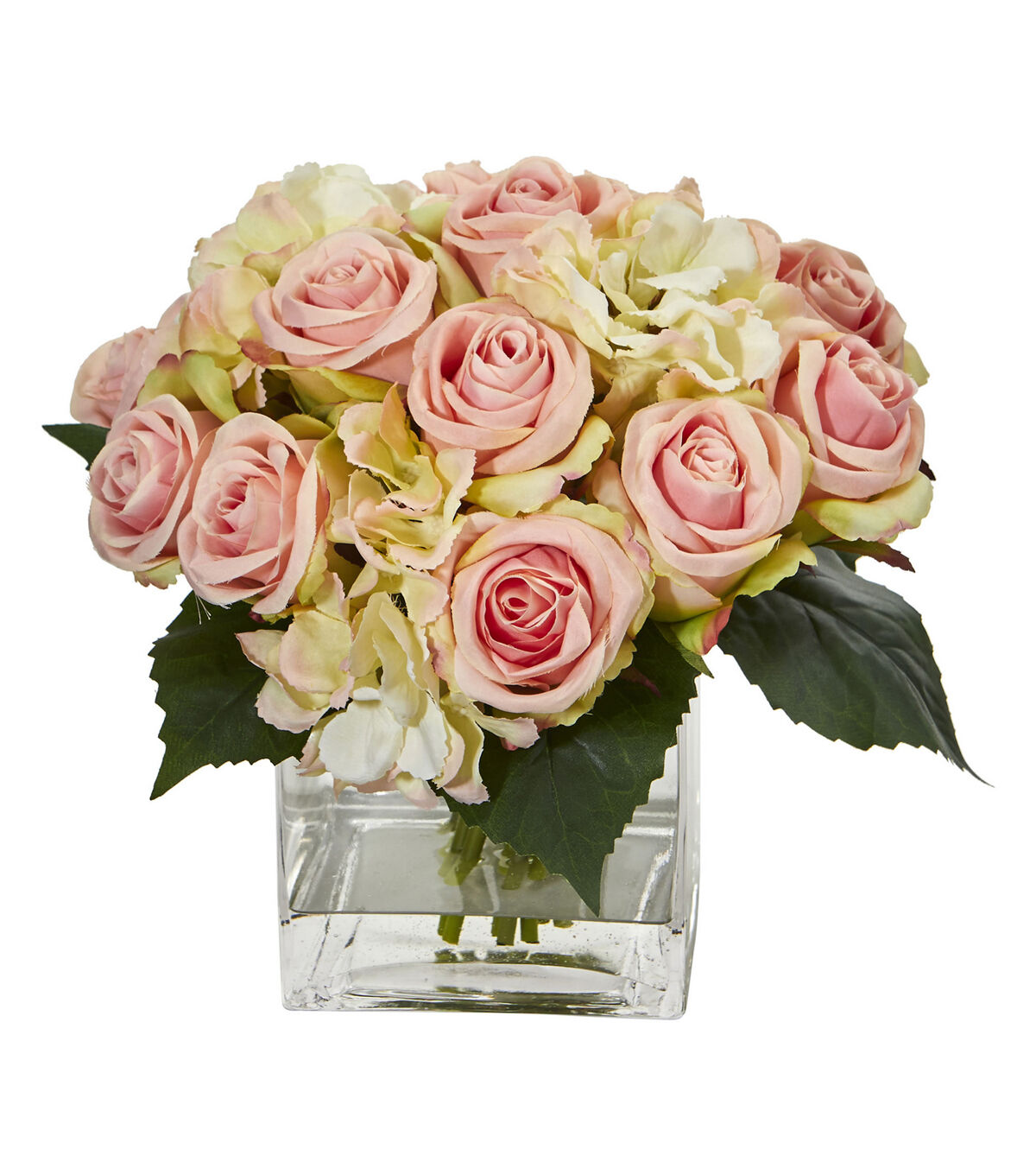 The artificial hydrangea bouquet arrangement contains fresh, soft pink blooms that softly accent the green leaves that sit beneath them, all bundled together in a simplistic square vase. With its incredibly lifelike, well-detailed blooms and leaves, it'll be the perfect decor piece for your dining room table. Place it on a mirrored tray and pair it with a single scented candle for a simple romantic setup.