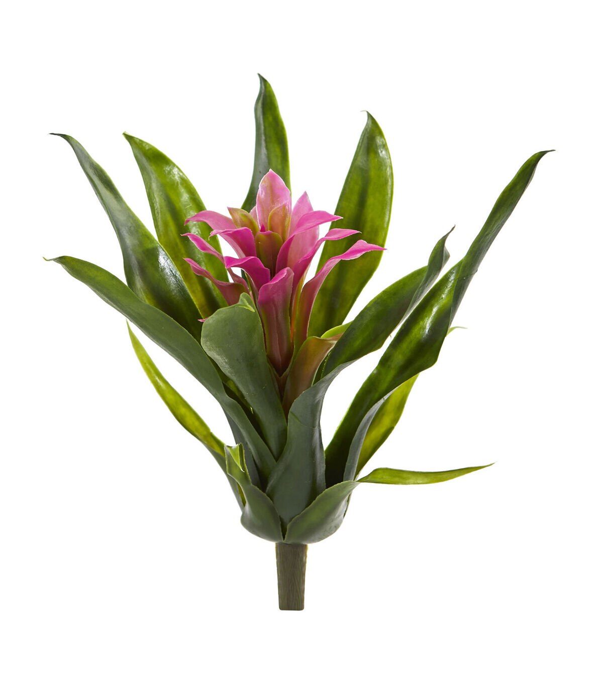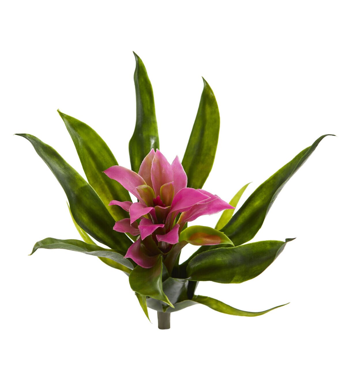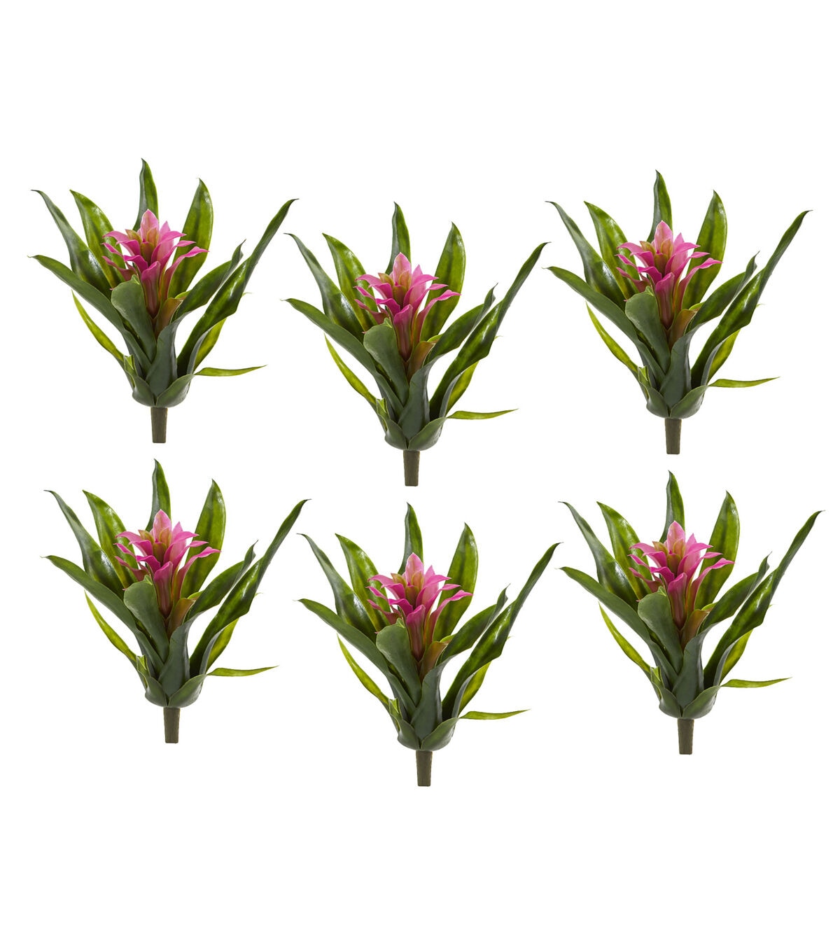 The lush green leaves of the bromeliad bush open to reveal a brilliant bloom. Like a small pocket of color, it looks stunning against the backdrop of a window pane. This lifelike plant is ideal for any room. Arrives with 6 bushes.