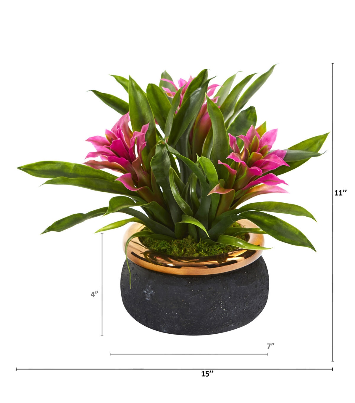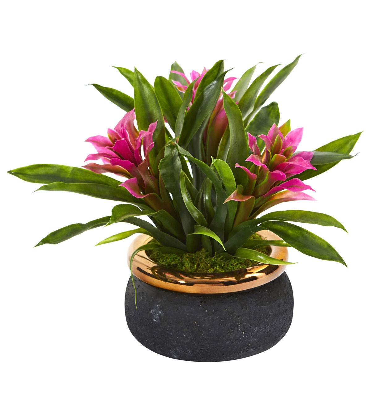 Inject striking color into your home with this artificial plant showcasing authentic looking details throughout its realistic looking foliage, handsomely complemented with faux bromeliad blossoms in bright, vivid hues. Standing 11in. high from a stoneware planter stabilized with natural moss, this silk plant would instantly freshen up tight spaces in a kitchen or dining room.