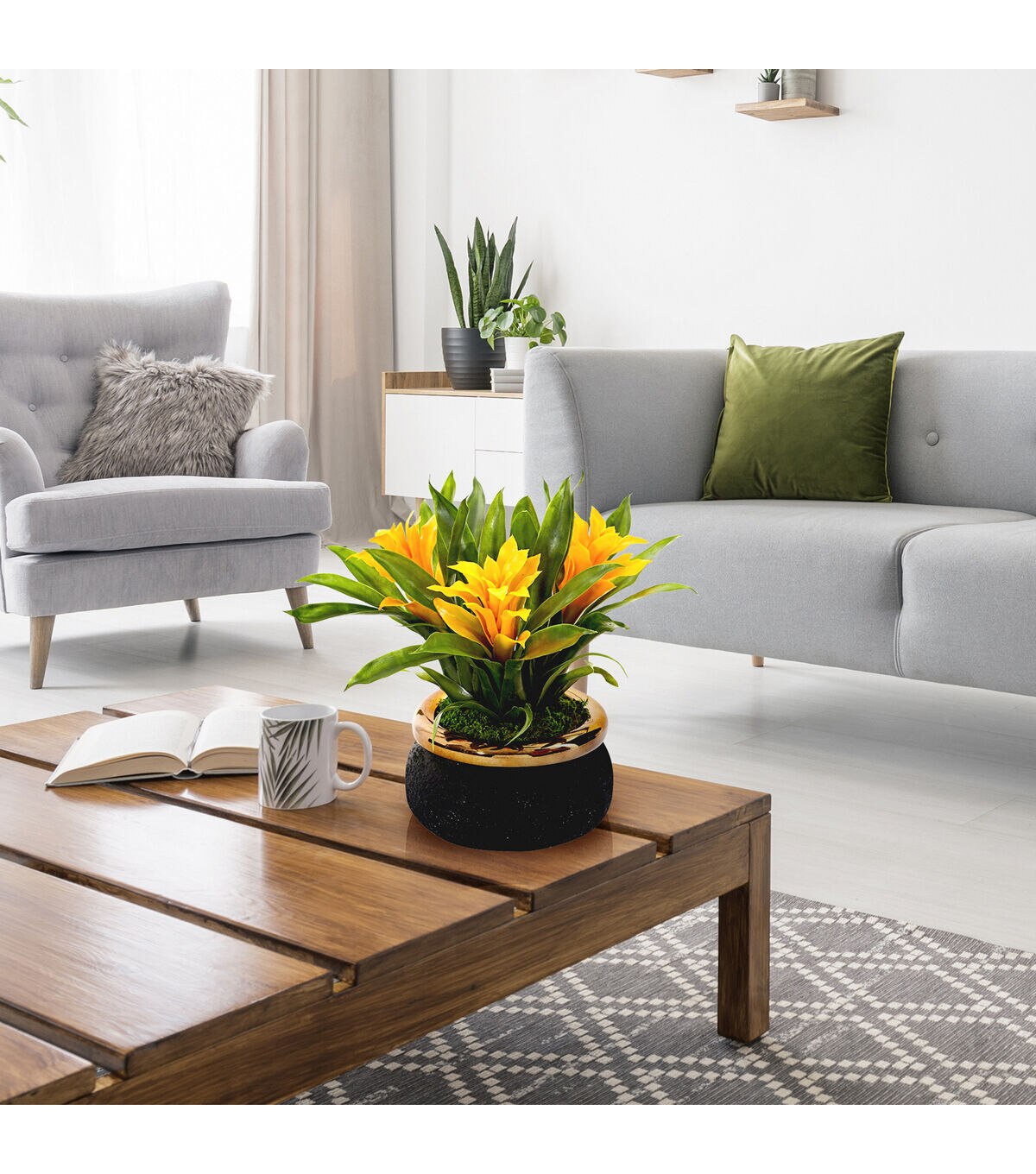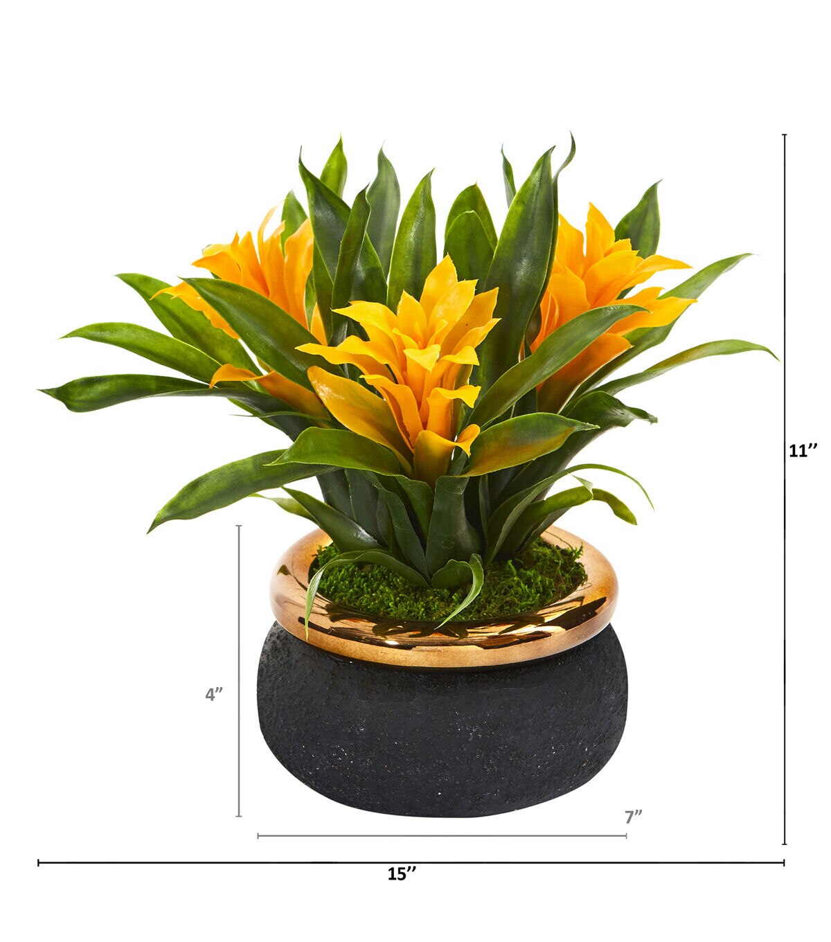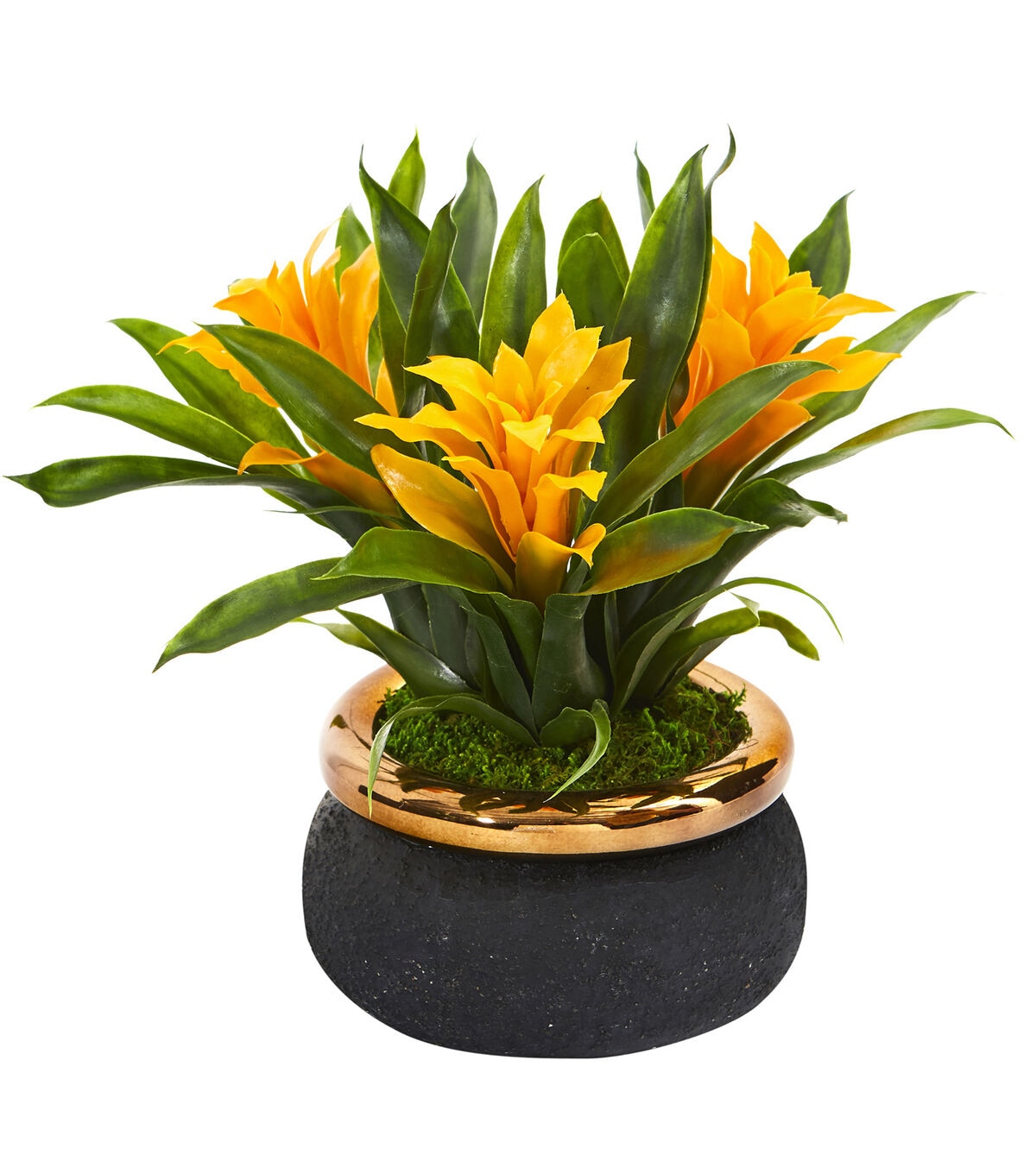Inject striking color into your home with this artificial plant showcasing authentic looking details throughout its realistic looking foliage, handsomely complemented with faux bromeliad blossoms in bright, vivid hues. Standing 11in. high from a stoneware planter stabilized with natural moss, this silk plant would instantly freshen up tight spaces in a kitchen or dining room.