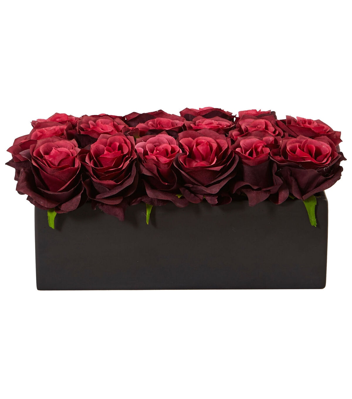 Bring the timeless elegance of red roses into any room in your home or office with these faux roses in a black rectangle planter. The entire arrangement is compact enough to work on nearly any surface you choose, from a dinner table centerpiece to a bright accent in a reception area.