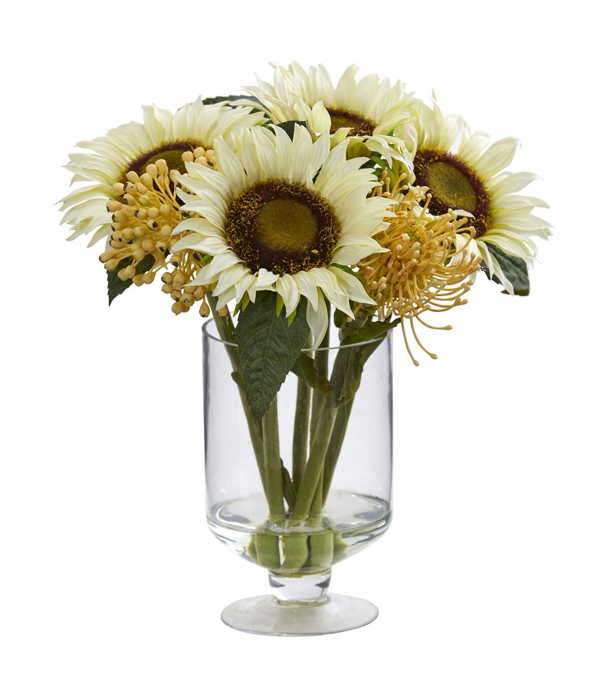 Elegant faux white sunflowers combined with sedum creates a calm, understated look that fits any decor. Perfect for placement on a desk or countertop. Comes in a clear glass vase with faux water for a complete, fresh look.