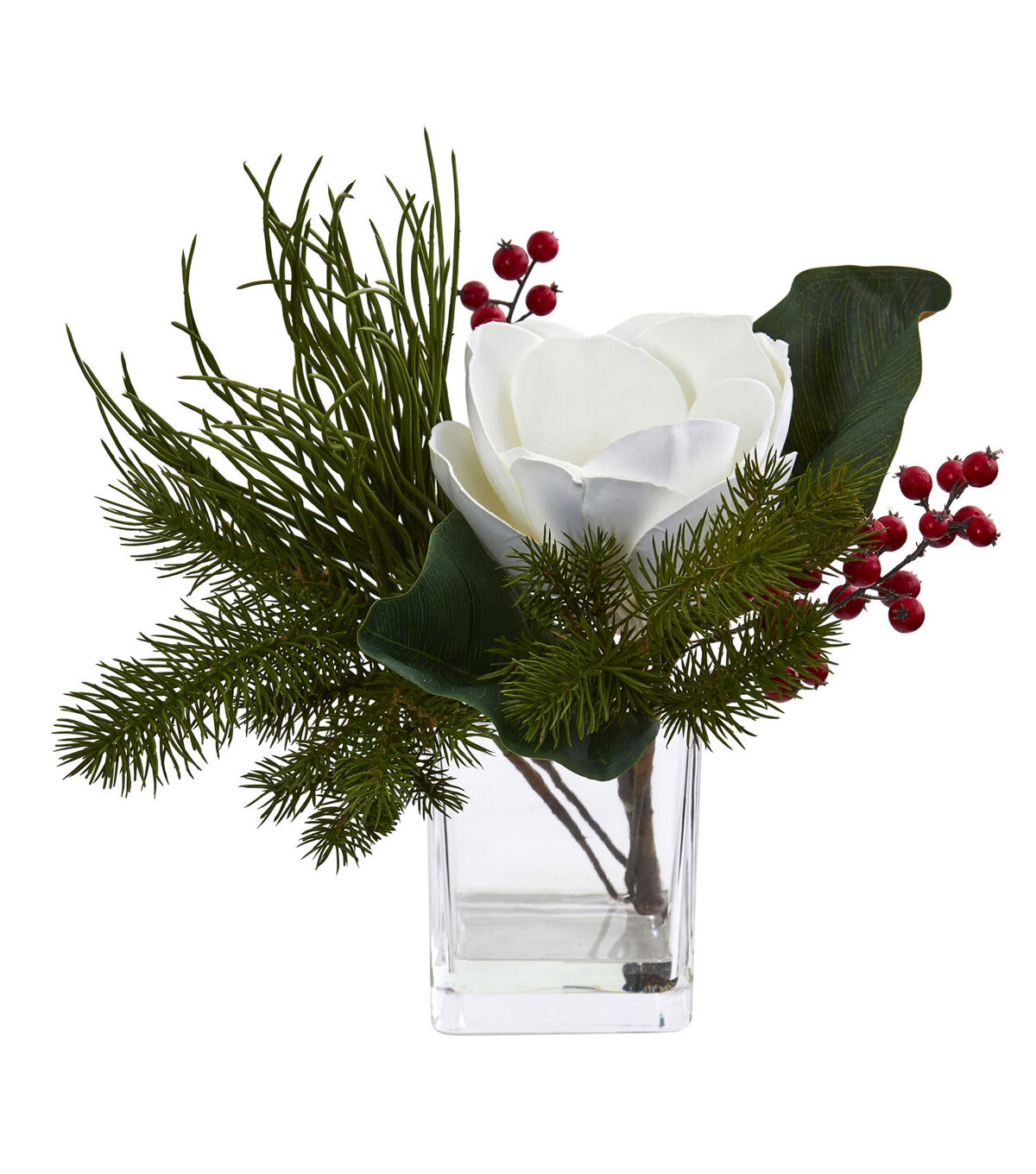 This single faux magnolia bloom is stunning in its simplicity. Surrounded by a green pine and red berry arrangement, it is a perfect addition for the months of winter. Place several on the mantle above a crackling fire! The clear glass cube reflects fire and candle light for a warm and intimate feel.