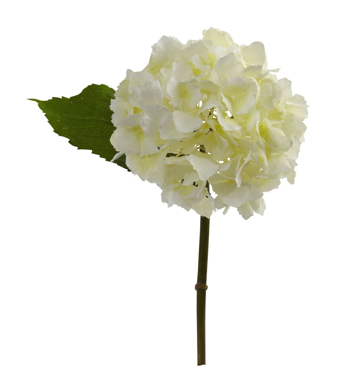 This hydrangea artificial flower will complement your existing faux floral arrangements. The 12-inch stem is topped with a tight cluster of bold lifelike blooms accented with a single realistic green leaf. You can also bundle these together in a crystal vase in your dining room for a colorful spring arrangement. Arrives with 12 individual flower stems.