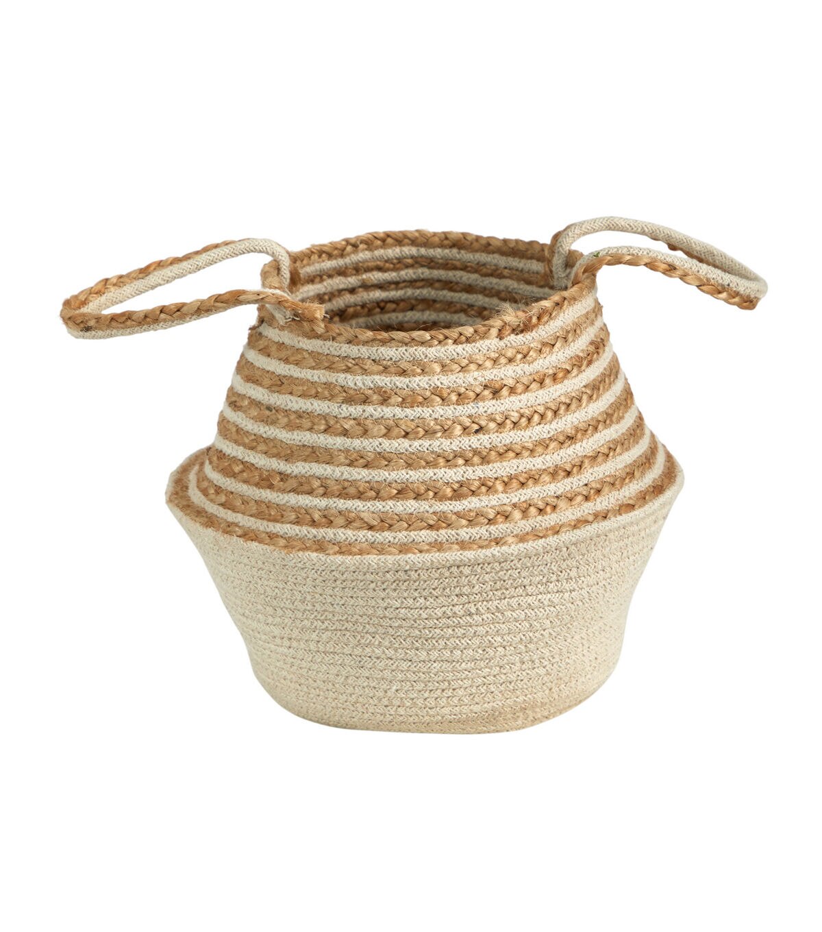 If you're looking for a cute, trendy accent to house your favorite faux-bulous plant, or a little extra storage, this jute and cotton basket is perfect. Handmade by artisans for long lasting use, feel authentic and natural, especially if you enjoy an earthy palette. For easy storing, this basket has two handles on each side. Standing 11in., add to any area in need of some texture and color. House pot sizes with a width less than 13in.. Has no drainage holes. Featuring intricate details, such as woven trim to offer a unique texture and a one of a kind look. Use this basket to plant your own creations, or simply display them empty -- they really are that impressive.