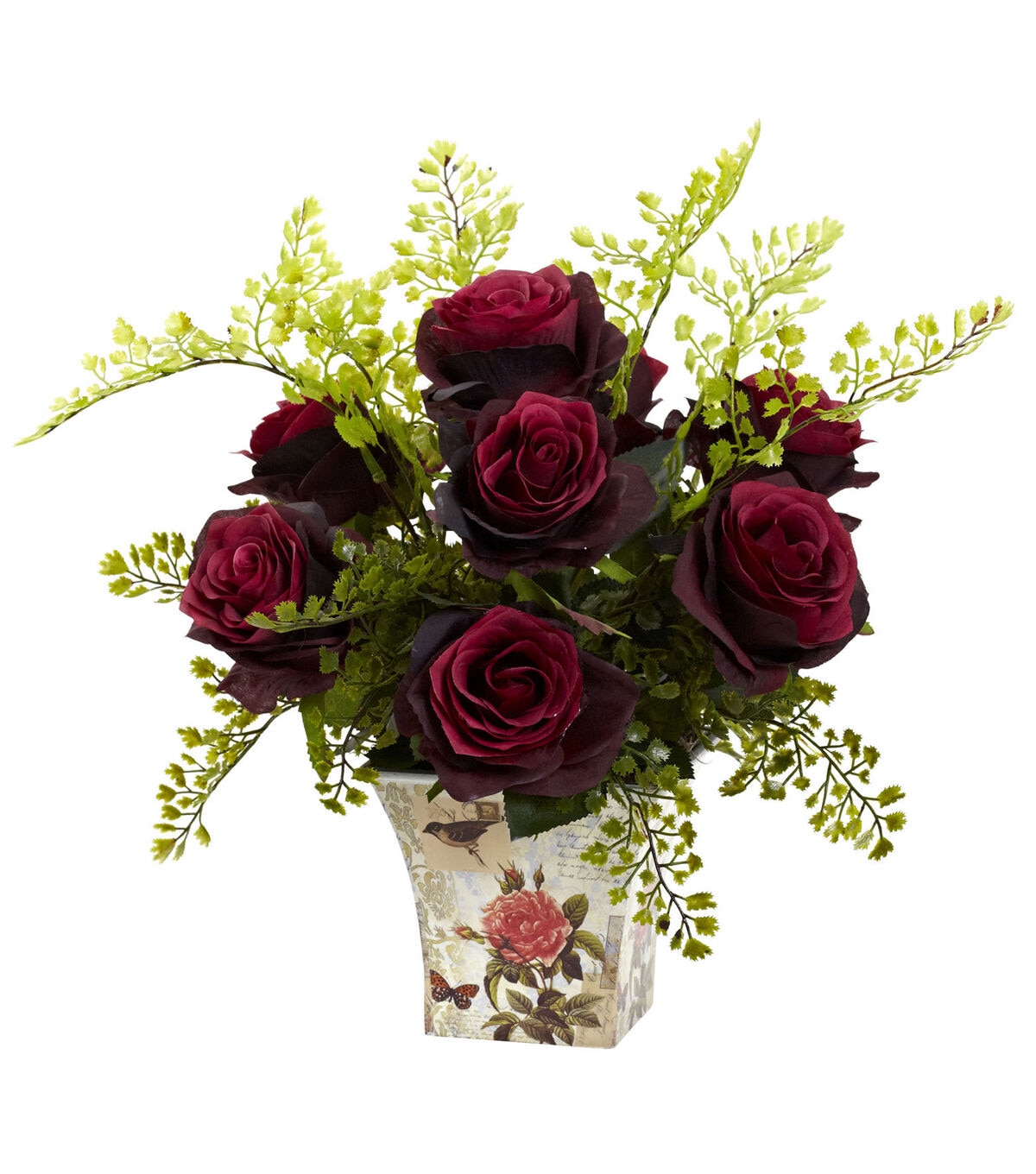 A perfect combination of textures, this Rose and Maiden Hair arrangement combines the natural beauty of full rose blooms with the wispy delightfulness of maiden hair. Then to top it off, we place this pairing in a charmingly decorated floral planter. This piece is perfect for home or office.