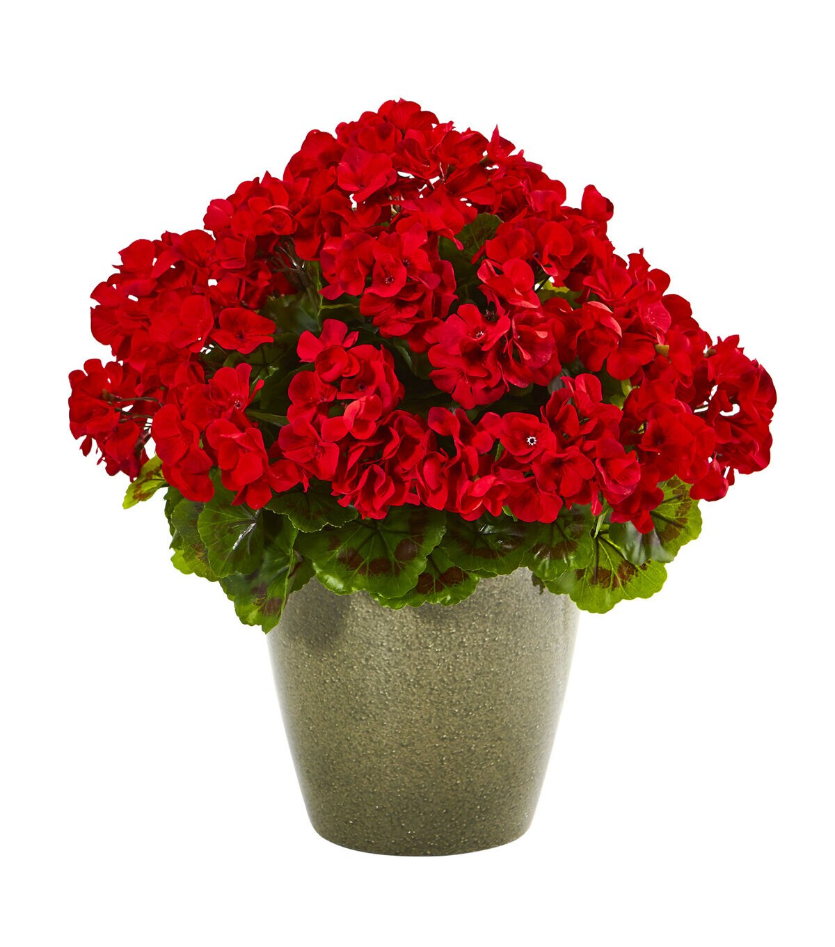 Incorporate serious coloring throughout everyday spaces with this artificial geranium plant flaunting a collection of intricate little floral nestled amidst vibrant green leaves peeping out from underneath - all of which is UV resistant, making it a great accent for both indoor and outdoor space. Contained in an accompanying planter, this 17” tall plant would beautiful spaces wherever displayed.