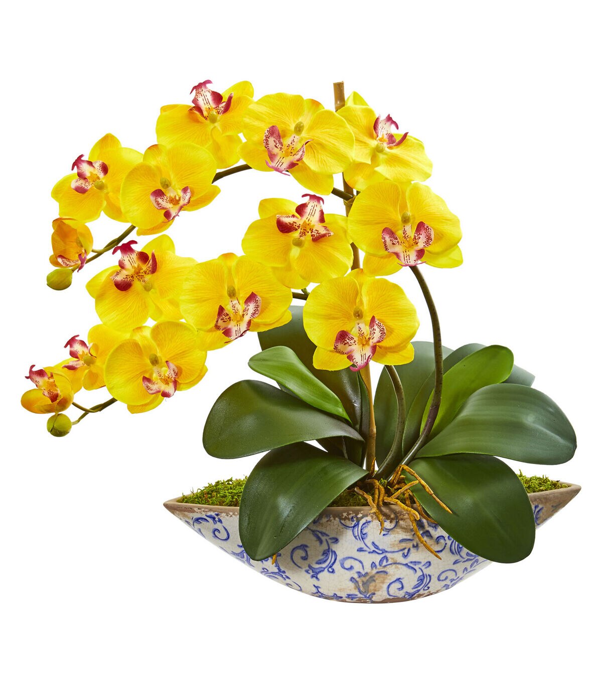 The realistic brilliant blooms of this phalaenopsis orchid artificial arrangement arch gracefully up and over glossy leaves, all settled in a printed decorative vase that's filled with faux green moss. Its elegant look makes it a perfect addition to your interior space. Position it on top of your sofa table or mantel and accent it with pillar candles for a charming setup.