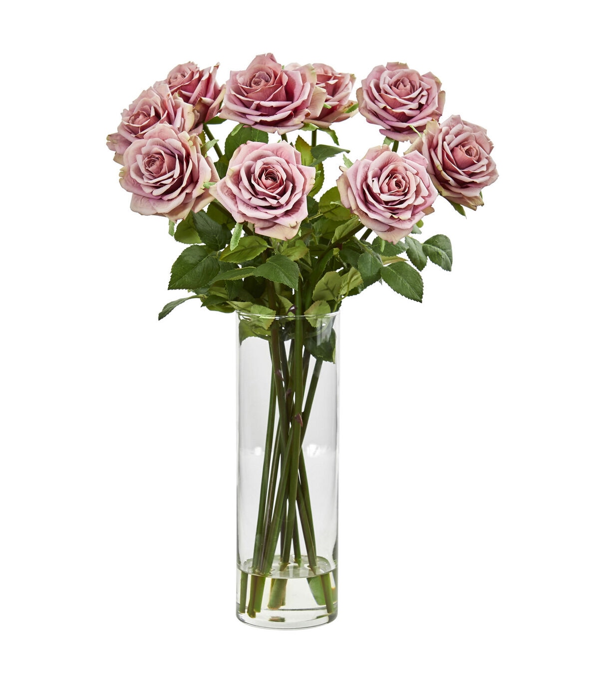 Full, romantic blossoms accented with just the right amount of foliage are bundled at the top of a clear cylinder vase with this rose artificial arrangement. With its regal coloring, this 19-inch ornament will be a beautiful accent piece on your shelf, end table, or mantel. Complement it with orange, blue, or pink glass hurricane vases for a simple yet sophisticated finish.