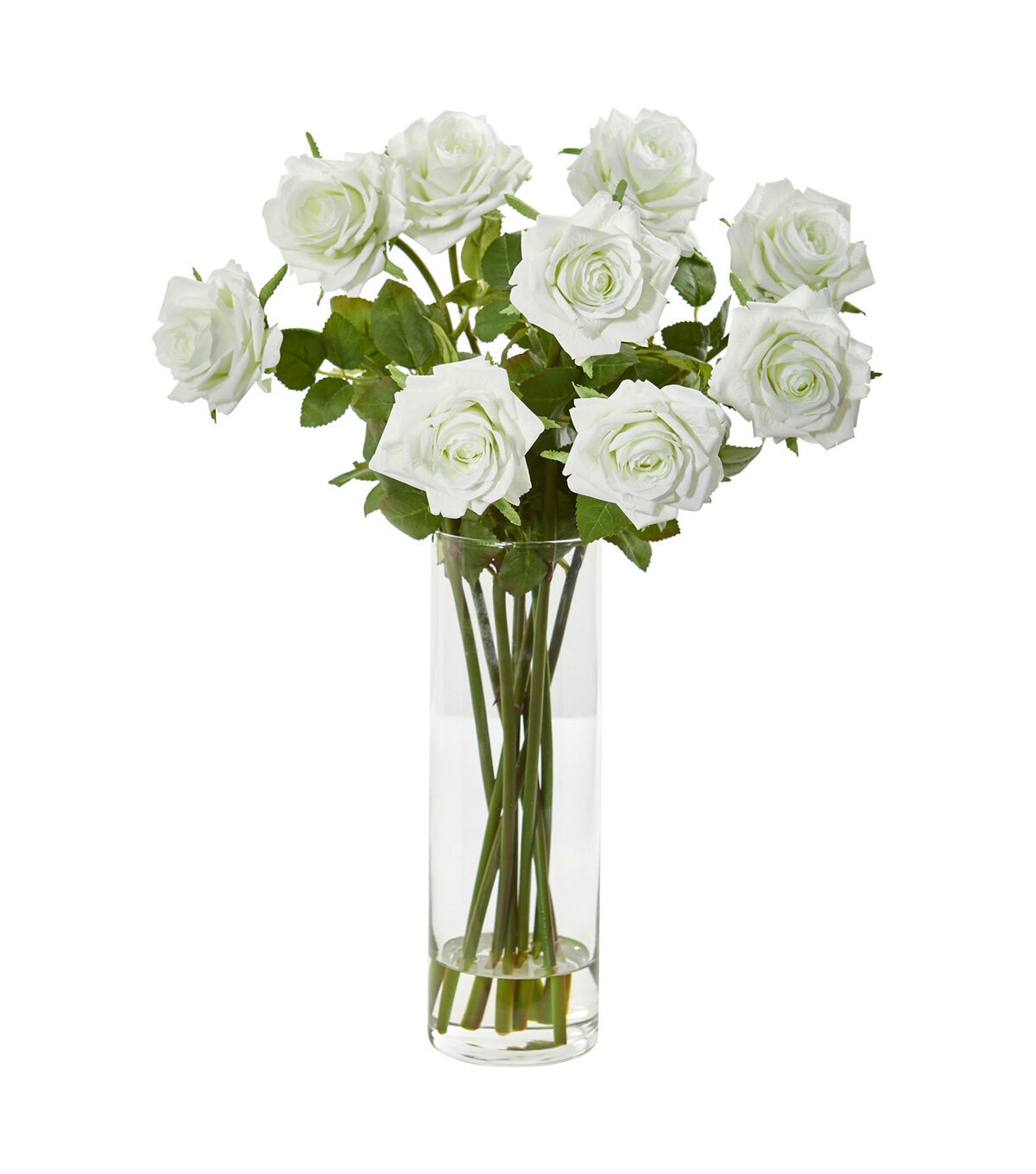 Full, romantic blossoms accented with just the right amount of foliage are bundled at the top of a clear cylinder vase with this rose artificial arrangement. With its regal coloring, this 19-inch ornament will be a beautiful accent piece on your shelf, end table, or mantel. Complement it with orange, blue, or pink glass hurricane vases for a simple yet sophisticated finish.