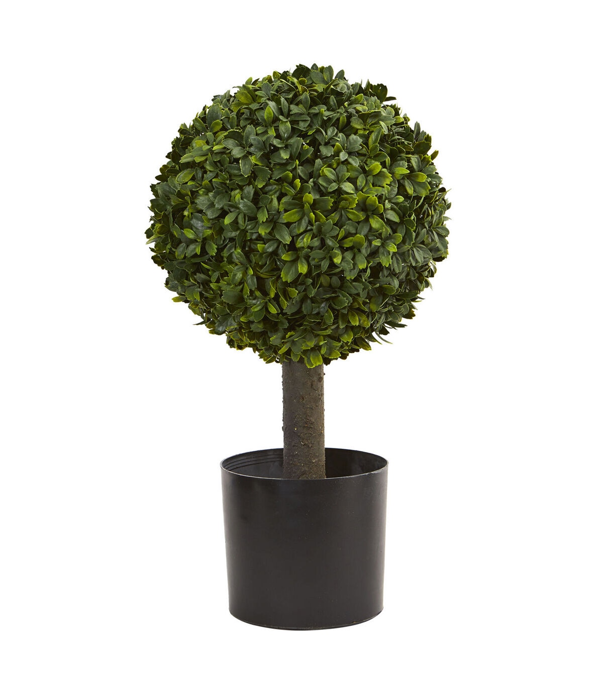 A single boxwood ball topiary sits atop a sturdy brown stem. The rich and deeply saturated greenery of this artificial plant are tightly clustered together. Perfect fit for an entry or end table.